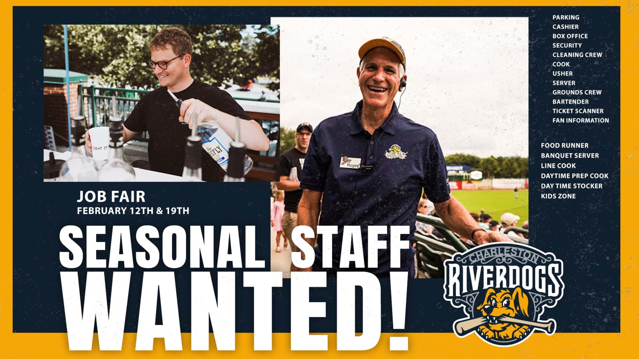 In preparation for the 2022 season, the Charleston RiverDogs will host job fairs on Saturday, February 12 and Saturday, February 19 from 10:00 a.m. to 1:00 p.m. at Joseph P. Riley, Jr. Park. Opportunities remain for qualified candidates to fill several part-time, seasonal positions for RiverDogs home games.