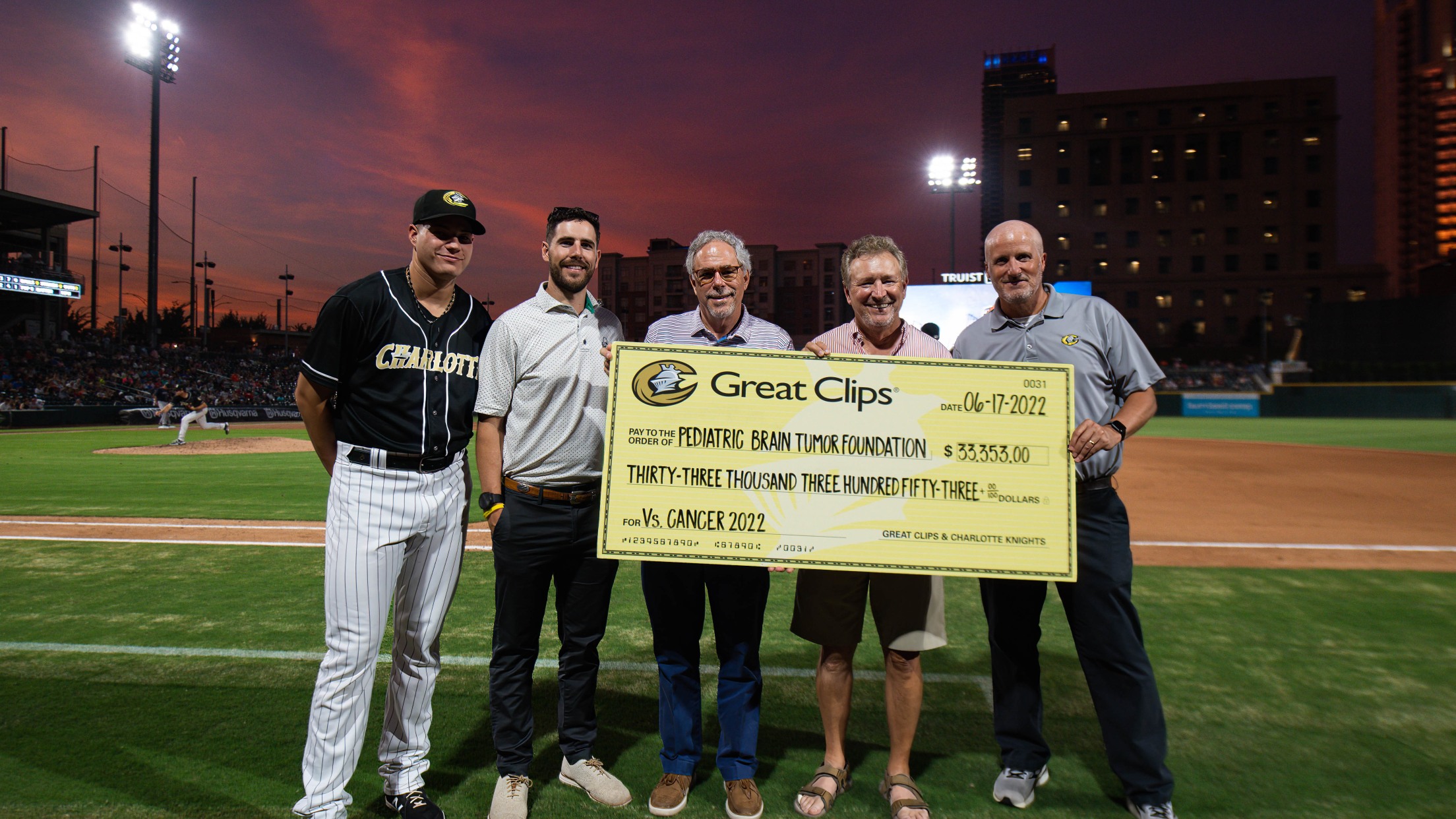 CHARLOTTE, NC — Every day, 13 children are diagnosed with a brain tumor, the deadliest form of childhood cancer. Great Clips and the Charlotte Knights, Triple-A affiliate of the Chicago White Sox, partnered for the eighth year in a row to help change that with a donation of $33,353 to