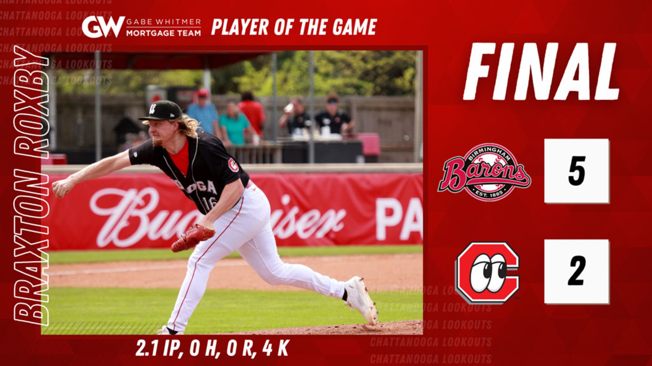 Lookouts reliever Braxton Roxby delivered 2.1 scoreless innings with four strikeouts, but Birmingham was able to tack on two insurance runs in the eighth inning off of Luis Mey.