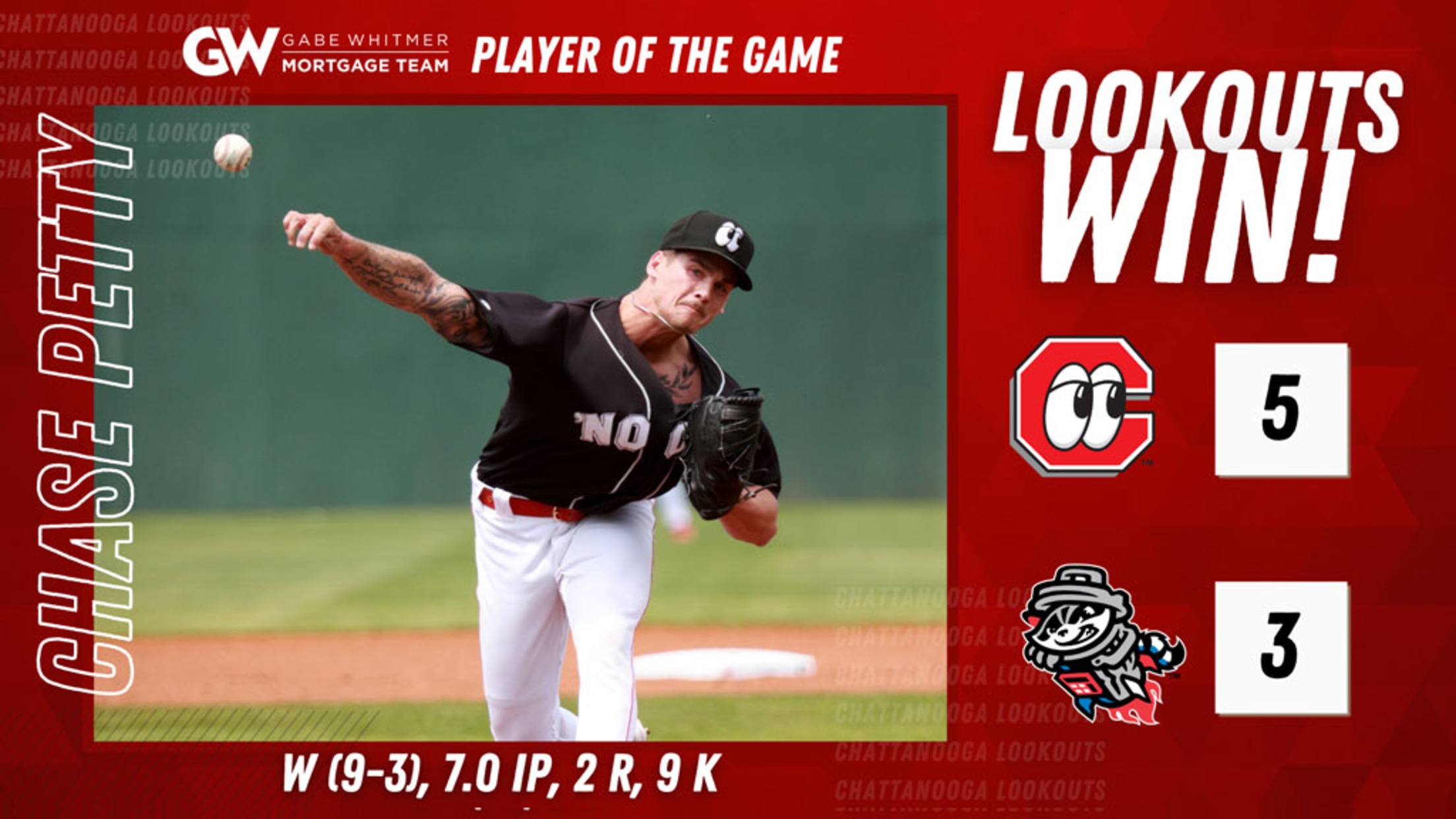 Lookouts starting pitcher Chase Petty was lights out in the team's 5-3 win over the Trash Pandas. Petty went a season-high seven innings and tied his season-high in strikeouts with nine. The right is now 9-3 on the year. Tonight Chattanooga struck first, scoring in the first inning on an