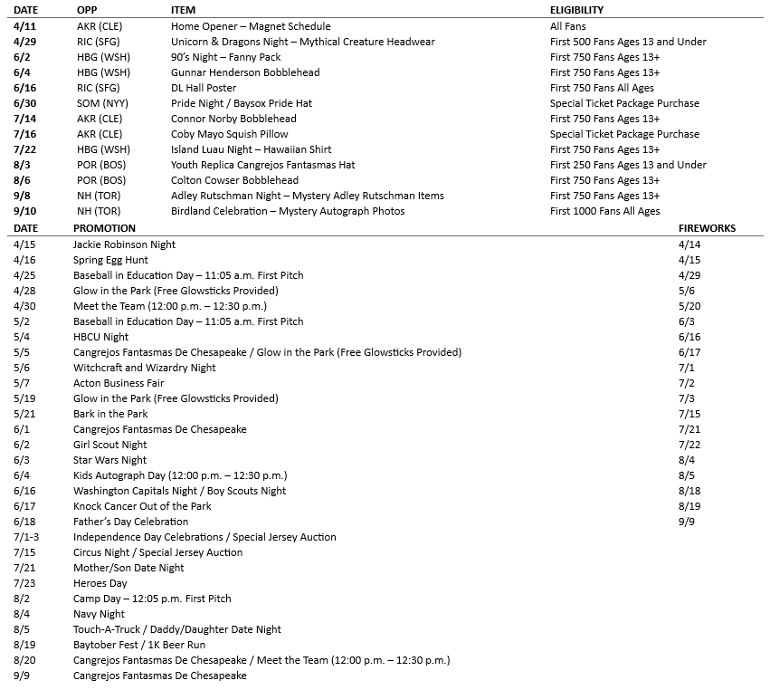 BOWIE, MD – The Bowie Baysox are pleased to reveal their full slate of promotions for the 2023 regular season.