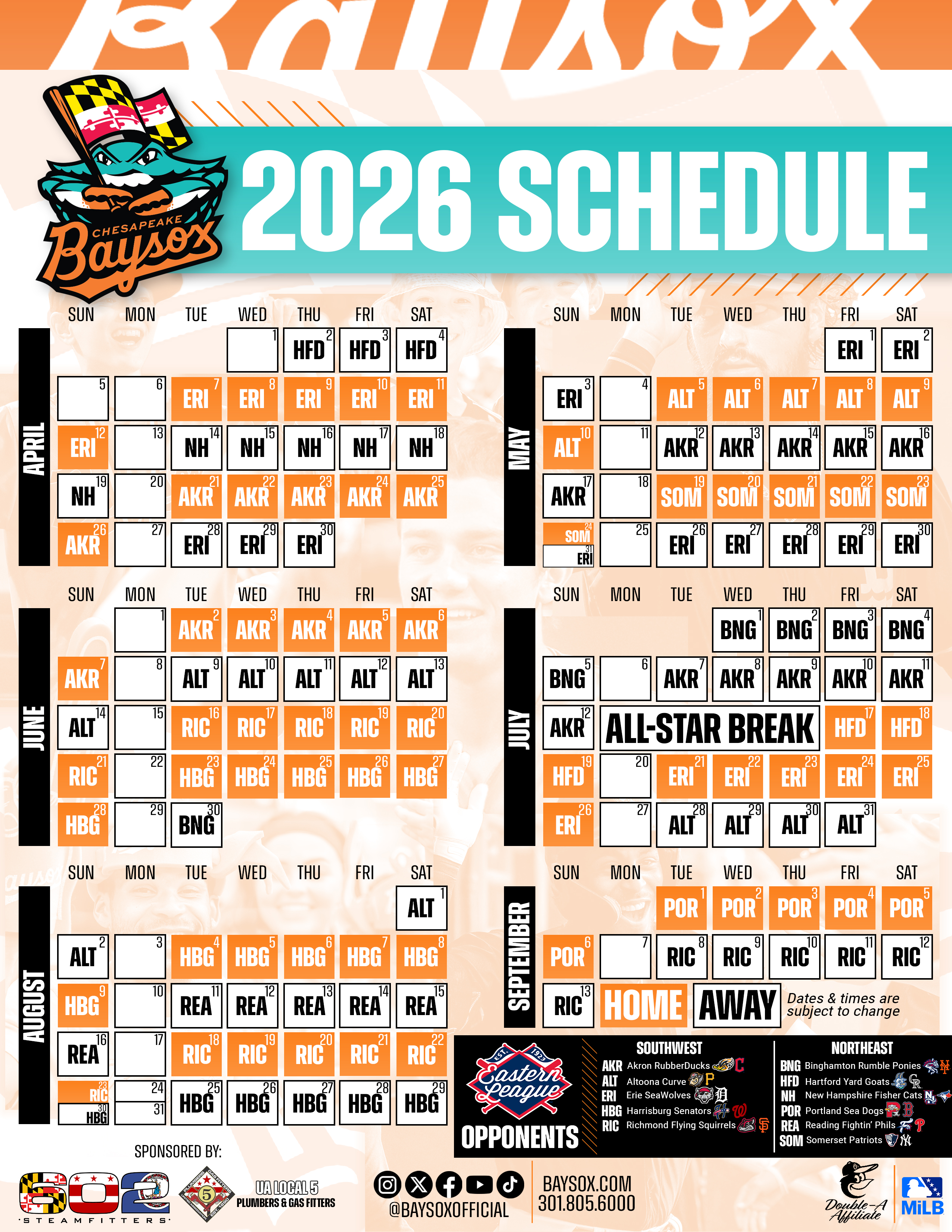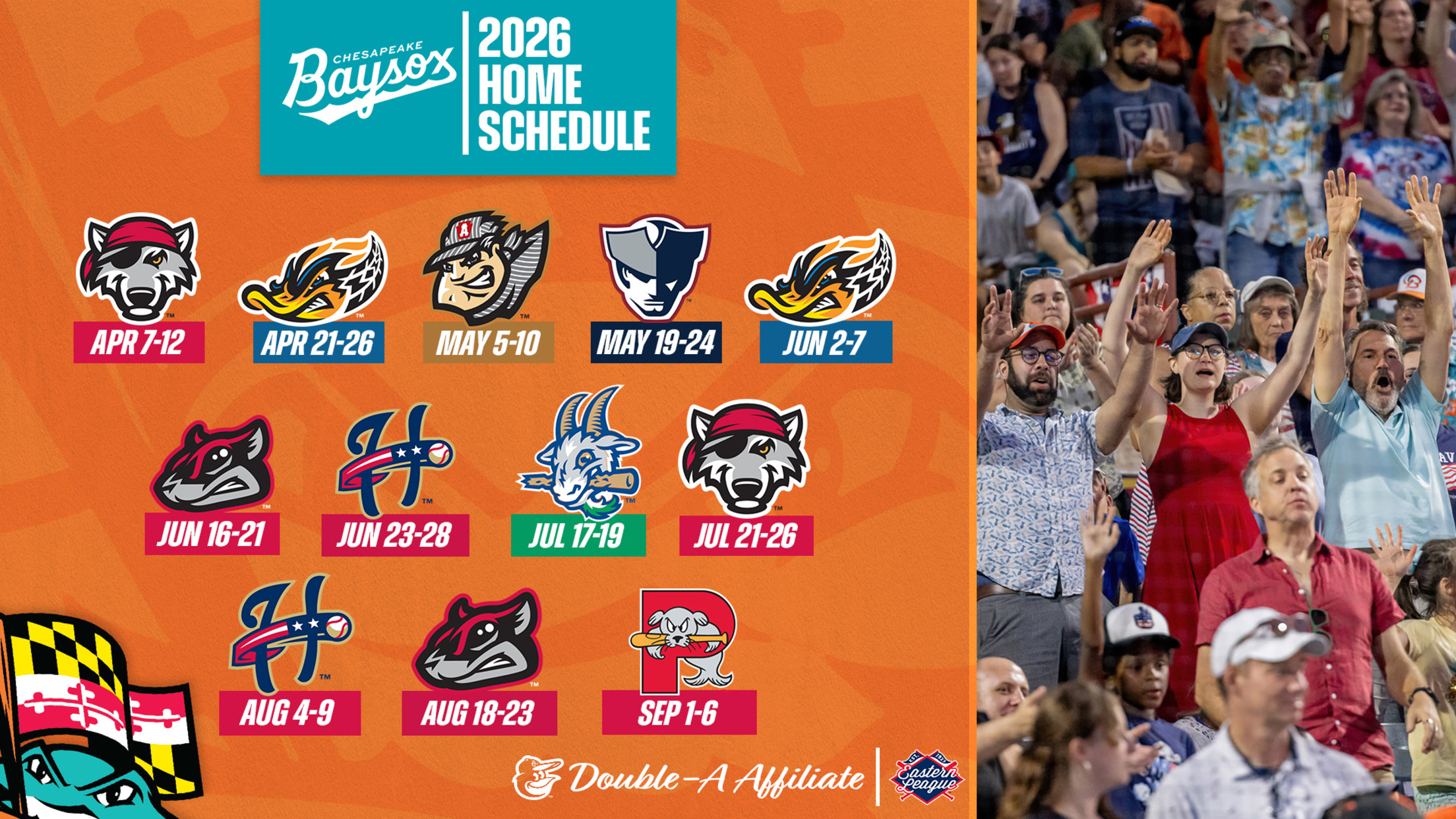 BOWIE, MD (August 26, 2025) – Get ready for another unforgettable summer at Prince George’s Stadium! The Chesapeake Baysox, proud Double-A affiliate of the Baltimore Orioles, are thrilled to announce their 2026 home schedule—and it’s packed with can’t-miss matchups, family fun, and fireworks-filled nights! The 33rd season of Baysox baseball