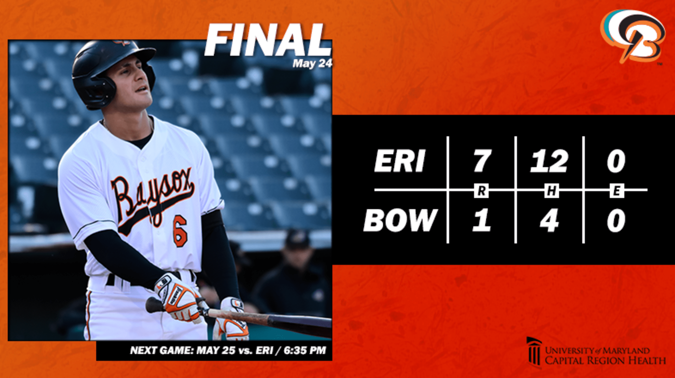 As Bowie falls to 14-23, This is the 11th loss in the last 13 games. Bowie and Erie continue their six-game series on Wednesday at Prince George’s Stadium, with the first pitch scheduled for 6:35 p.m.