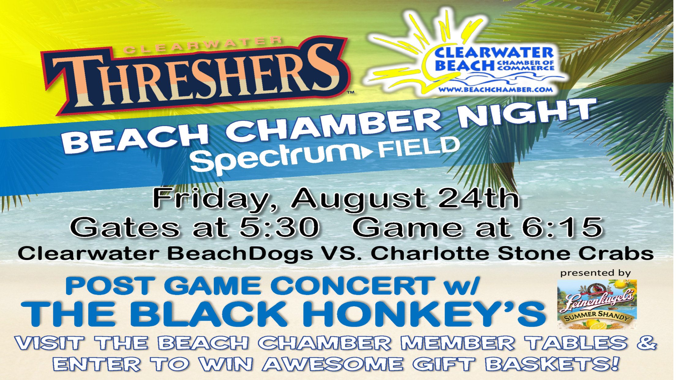 Beach Chamber Night Flyer PDFCLEARWATER, Fla. - Join the Clearwater Beach Chamber of Commerce at Spectrum Field on Friday, August 24. More than 30 Clearwater Beach businesses and restaurants will be represented with tables on the concourse offering games and giveaways.The gates open at 5:30 p.m. for the 6:15 p.m.