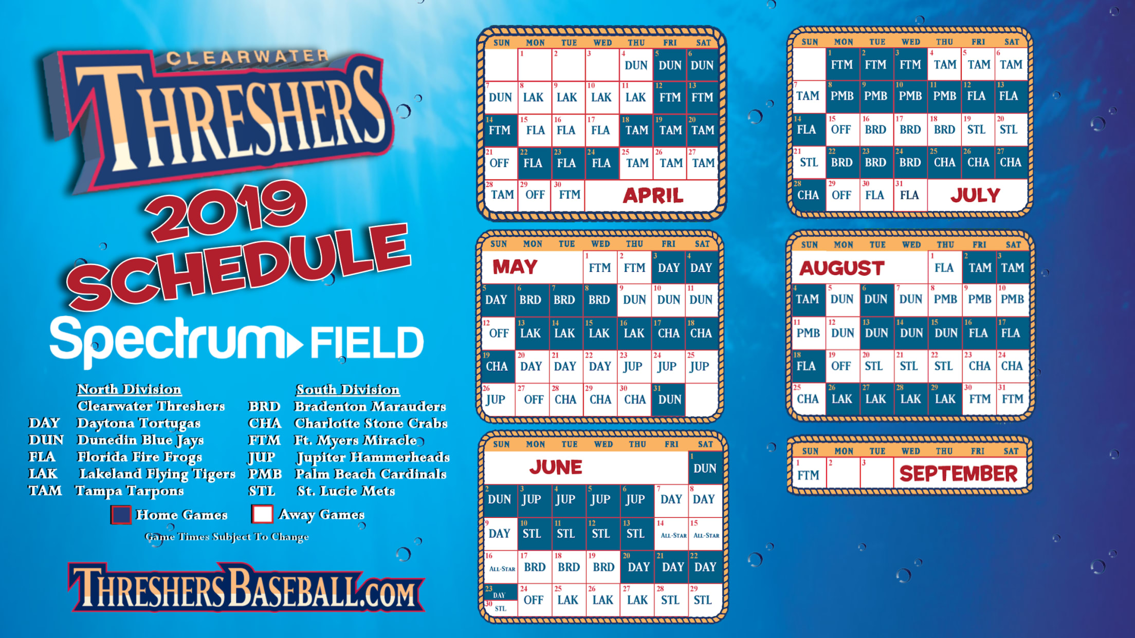 CLEARWATER, Fla. - The 2019 game schedule for the Clearwater Threshers is now available. The summer slate of 70 home games at Spectrum Field opens in April and runs through August. Call the BayCare Box Office at 727-467-4457 for more information about season ticket plans or group outings. Game times, promotions,
