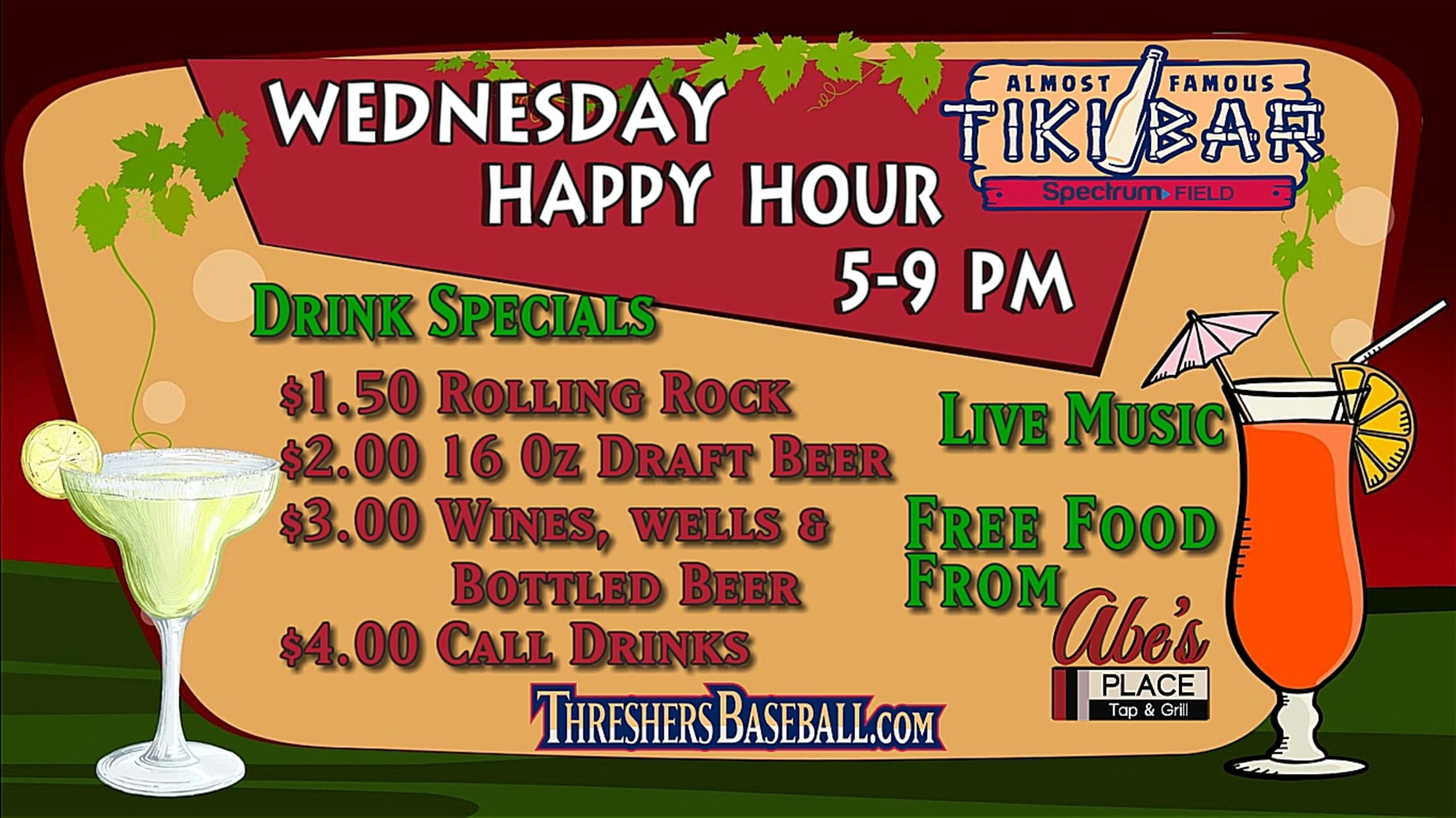The last Happy Hour Wednesday of 2017 at Spectrum Field is December 13! Join the Threshers from 5:00-9:00 p.m. for free admission, drink specials, music, corn toss, and disc golf - all at Frenchy's Tiki Bar in left field overlooking the beautiful ballpark.