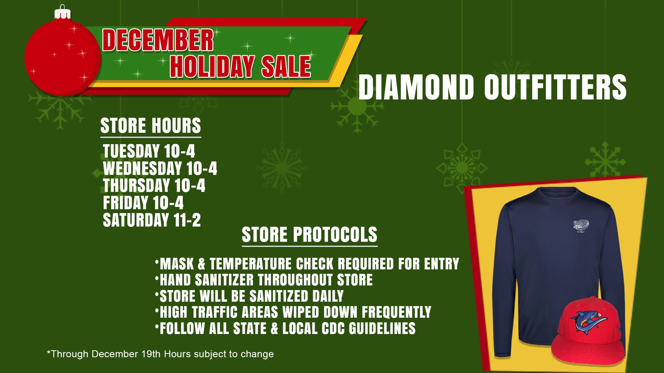 Take advantage of the 2020 Diamond Outfitters Holiday Sale online and in-person. The Clearwater Threshers' Team Store at Spectrum Field will be open for special hours with enhanced safety protocols through December 19th. - Saturday, Dec. 5: 11a-2p - Tuesday, Dec. 8 - Friday, Dec. 11: 10a-4p - Saturday, Dec.