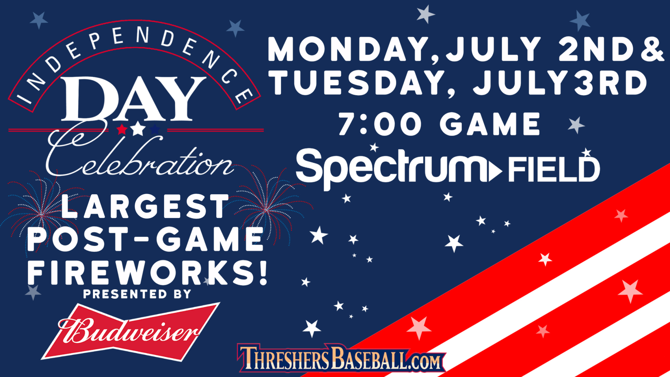 CLEARWATER, Fla. - Celebrate Independence Day with the BIGGEST fireworks shows of the season at Spectrum Field on July 2 and 3. The Threshers will have the same, huge fireworks display each night - presented by Budweiser.