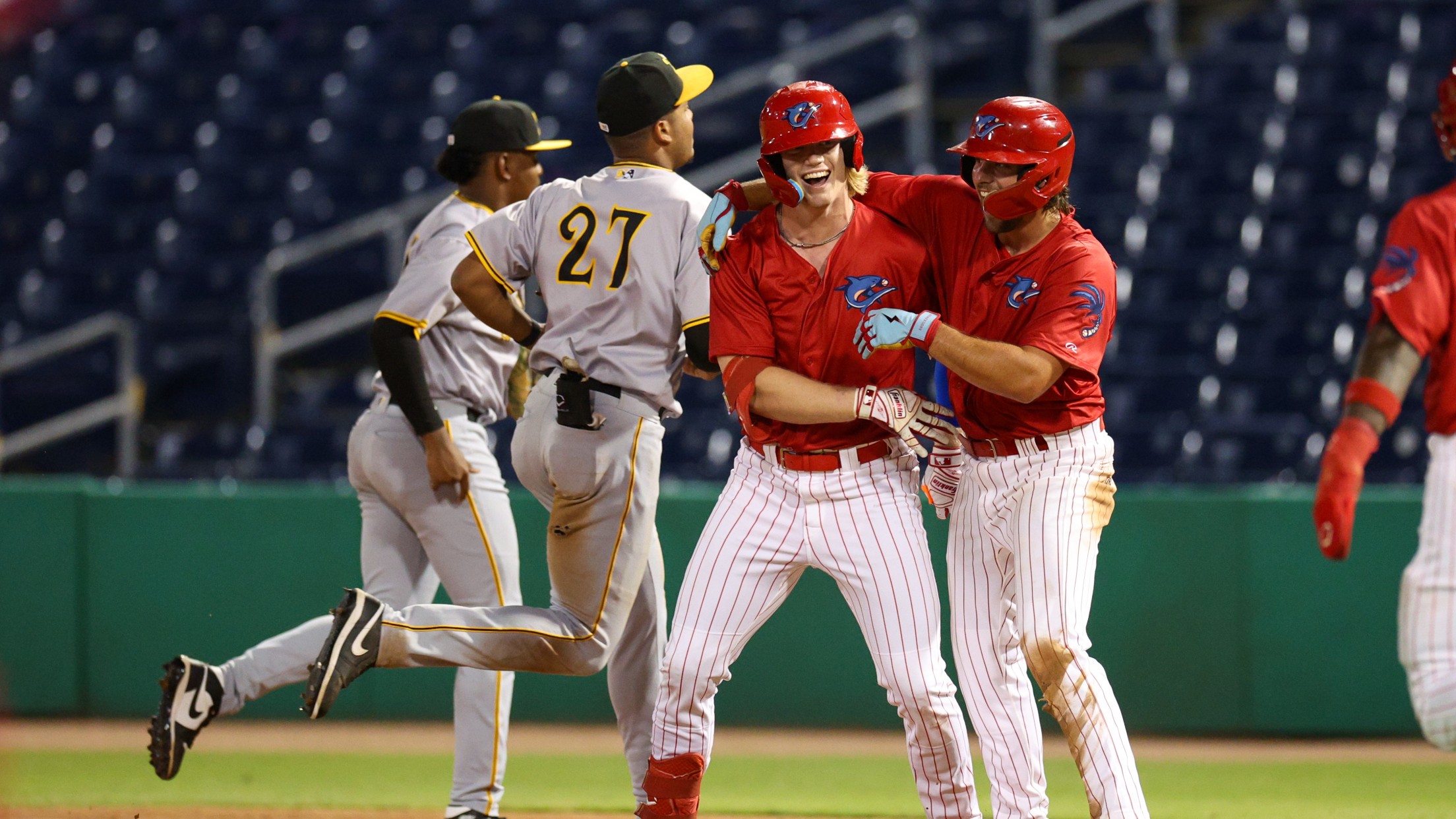 Threshers OFs Jordan Viars and Pierce Bennett celebrate a walkoff win over the Bradenton Marauders.