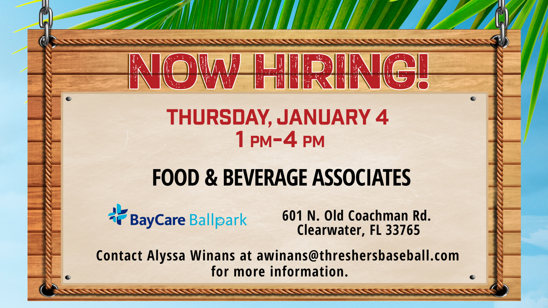 CLEARWATER, Fla. - The Philadelphia Phillies Florida Operations are now hiring reliable, positive, seasonal game day staff for 2024 Spring Training and Threshers seasons! BayCare Ballpark will be hosting job fairs in January 2024 to fill food & beverage positions.