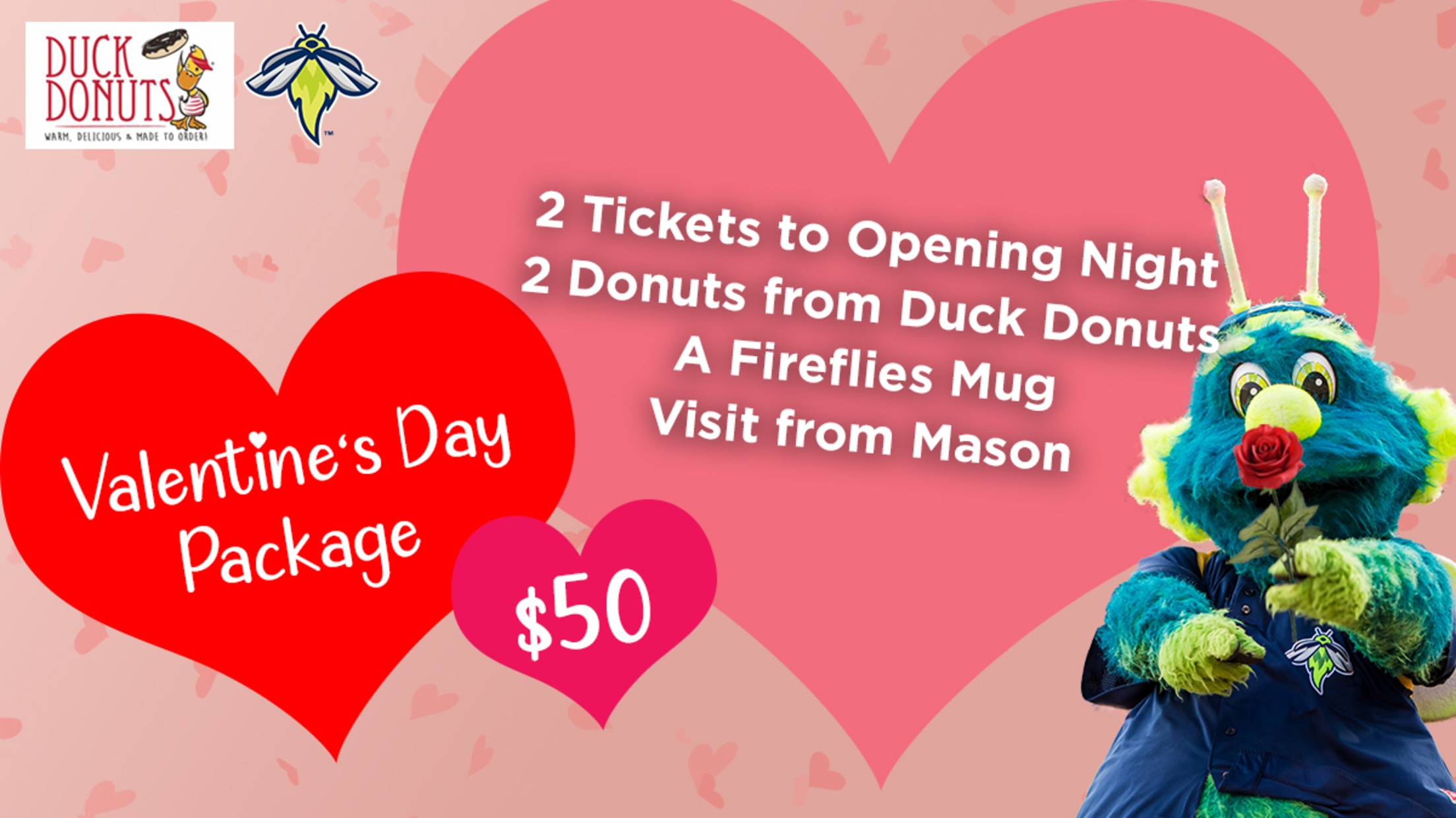 COLUMBIA, SC – The Midlands favorite Firefly, Mason, is spreading love throughout Columbia again this year! Fireflies fans can now purchase a surprise Mason Valentines delivery for their loved ones. For each Valentine purchased, Mason will deliver two tickets to Fireflies Opening Night on April 8, a Fireflies coffee mug and two delicious donuts, courtesy of Duck Donuts. Mason’s Valentines are $50 per package.