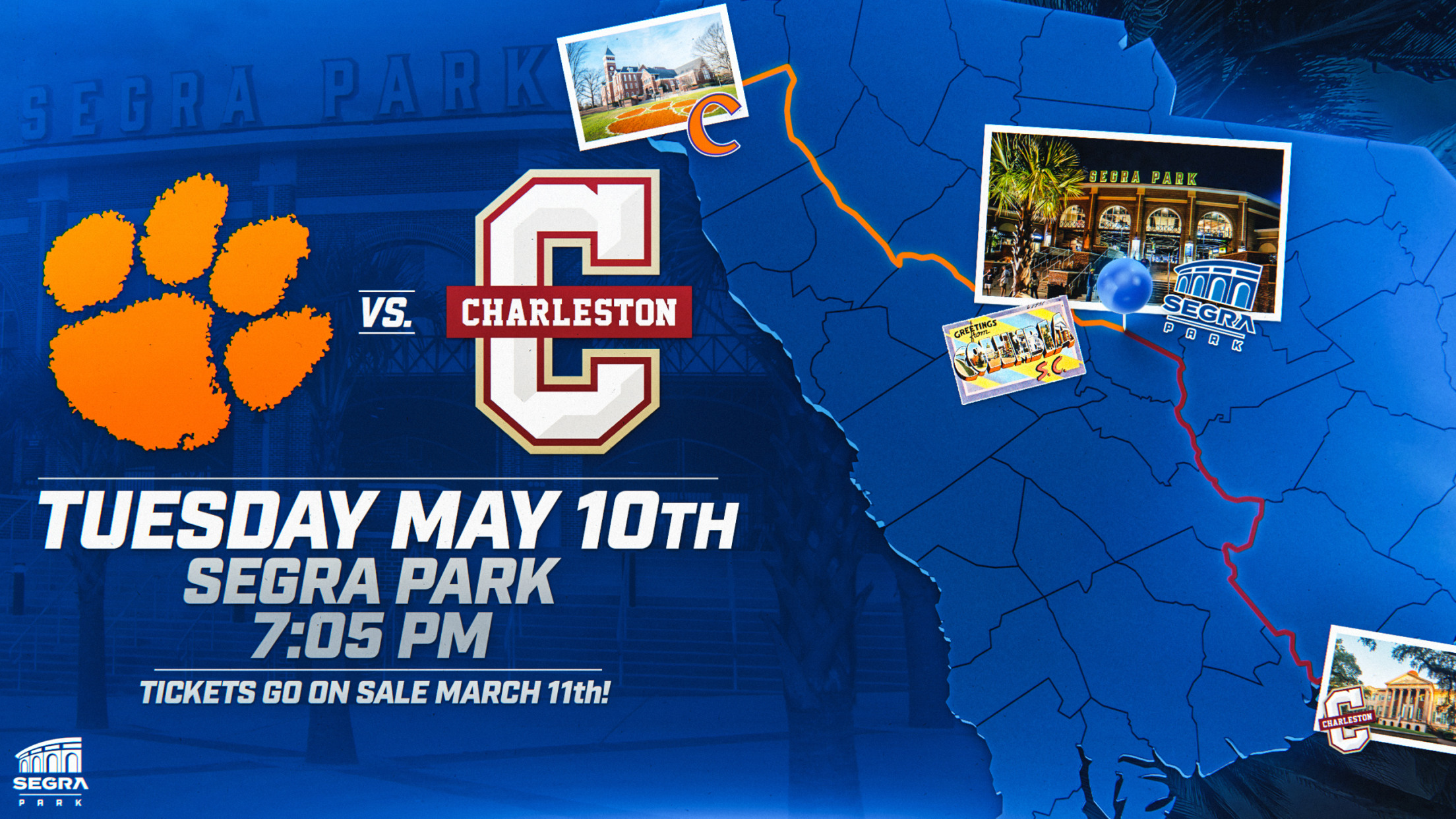 COLUMBIA, SC – The Columbia Fireflies, the Clemson University Athletics Department and the College of Charleston Athletics Department have announced that the two collegiate baseball foes will face-off on neutral ground at Segra Park Tuesday, May 10 at 7:05 pm.
