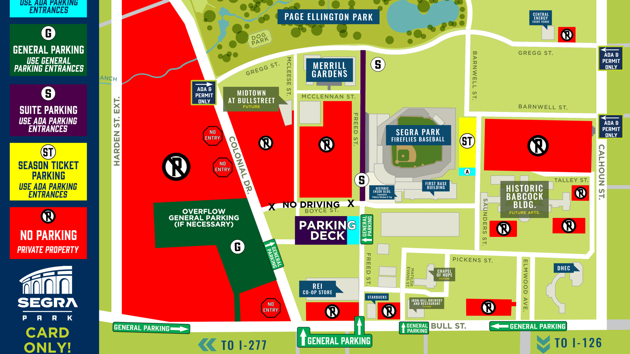 General parking will be available in the City of Columbia’s Freed Street parking deck. An updated parking map is available here. General parking in the City of Columbia parking deck will be $7 per vehicle. Please note that Boyce Street between Freed and Colonial will remain closed for pedestrian access only during Fireflies home games.