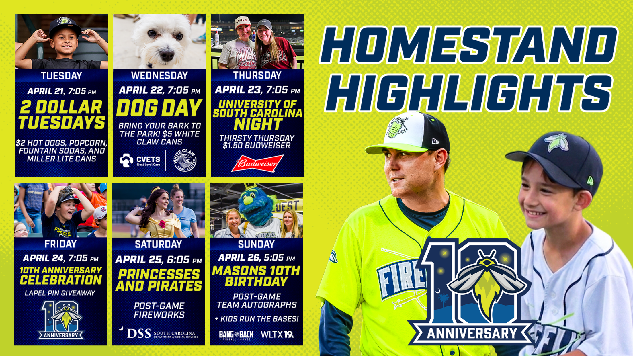 COLUMBIA, S.C. — The Fireflies longest-standing rivalry starts back up this week at Segra Park. Join the team as they battle The Augusta GreenJackets (Class-A, Atlanta Braves). While the teams are playing, check out fireworks, great giveaways and special milestone nights as The Fireflies celebrate their historic 10th anniversary.