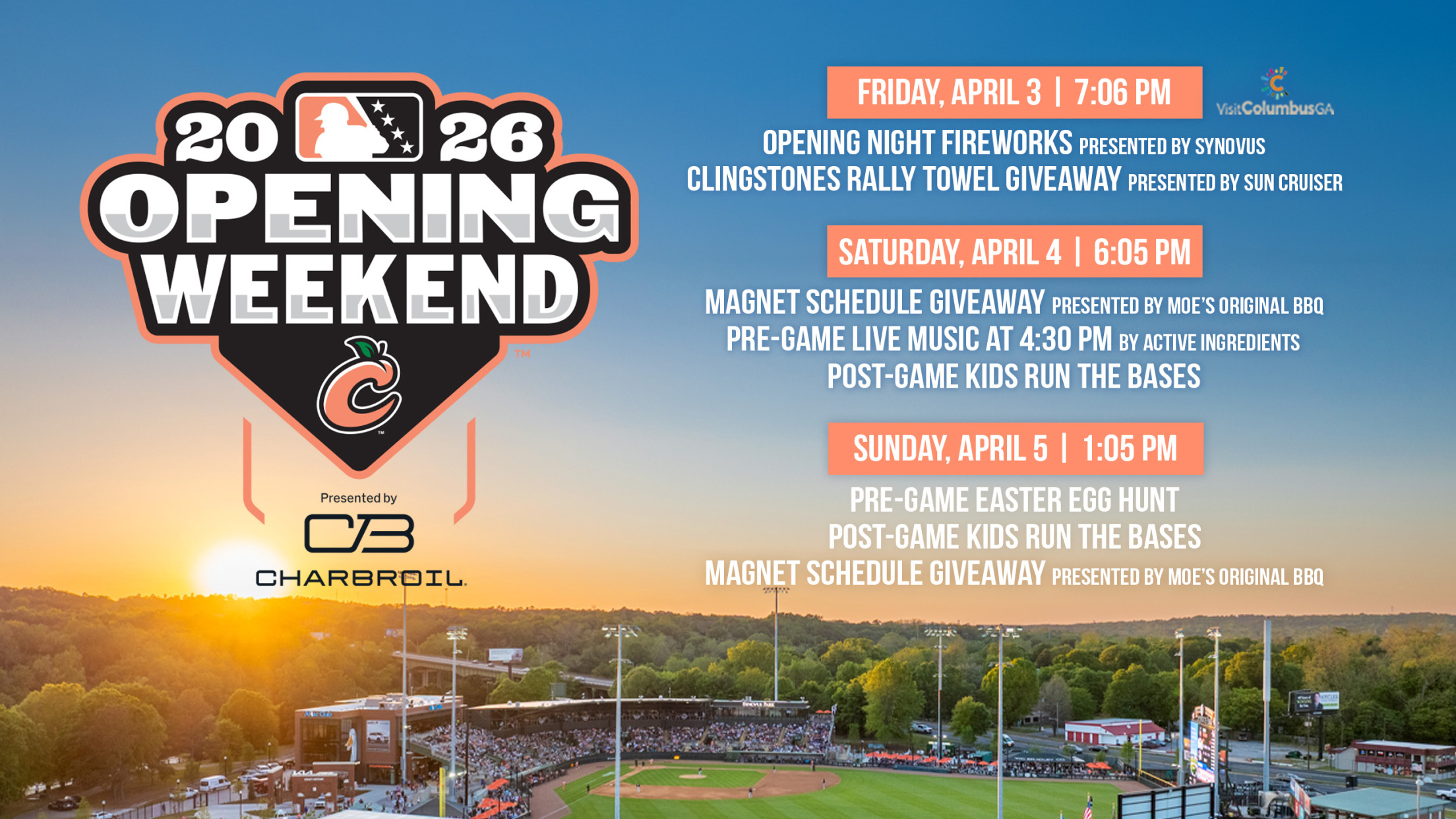 COLUMBUS, Ga. — The Columbus Clingstones start off their 2026 season by celebrating Opening Weekend, presented by Charbroil! This weekend includes post-game fireworks, premium giveaways, and an Easter Sunday Egg Hunt on April 5 to headline a three-game homestand against the Chattanooga Lookouts (Double-A, Cincinnati Reds) at Synovus Park, April