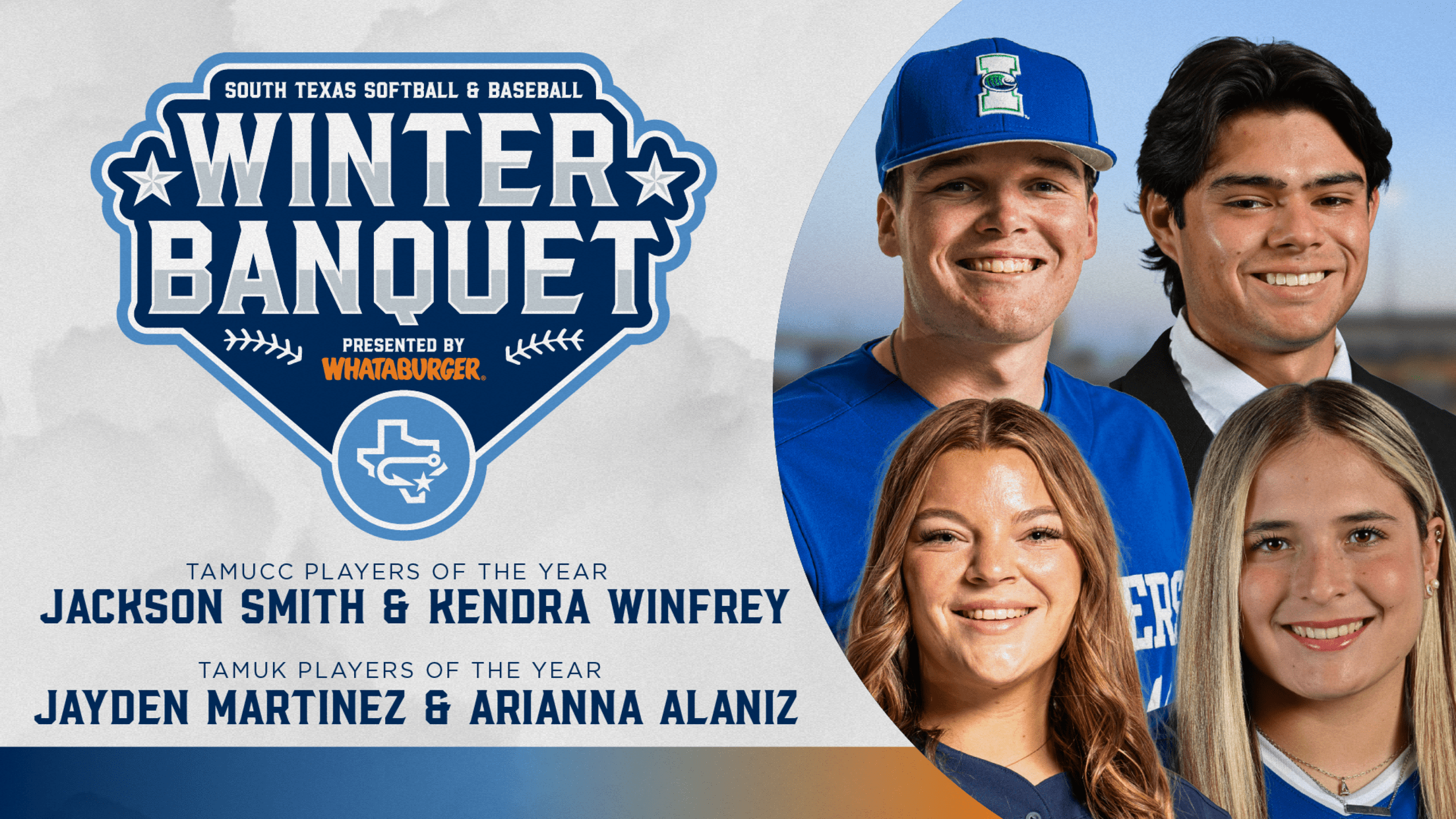 CORPUS CHRISTI – Kendra Winfrey and Jackson Smith of Texas A&M-Corpus Christi and Texas A&M-Kingsville’s Arianna Alaniz and Jayden Martinez will be recognized Thursday, January 15 at the Hilliard Center’s Henry Garrett Ballroom in recognition of their standout 2025 campaigns. The 20th South Texas Softball and Baseball Winter Banquet, presented