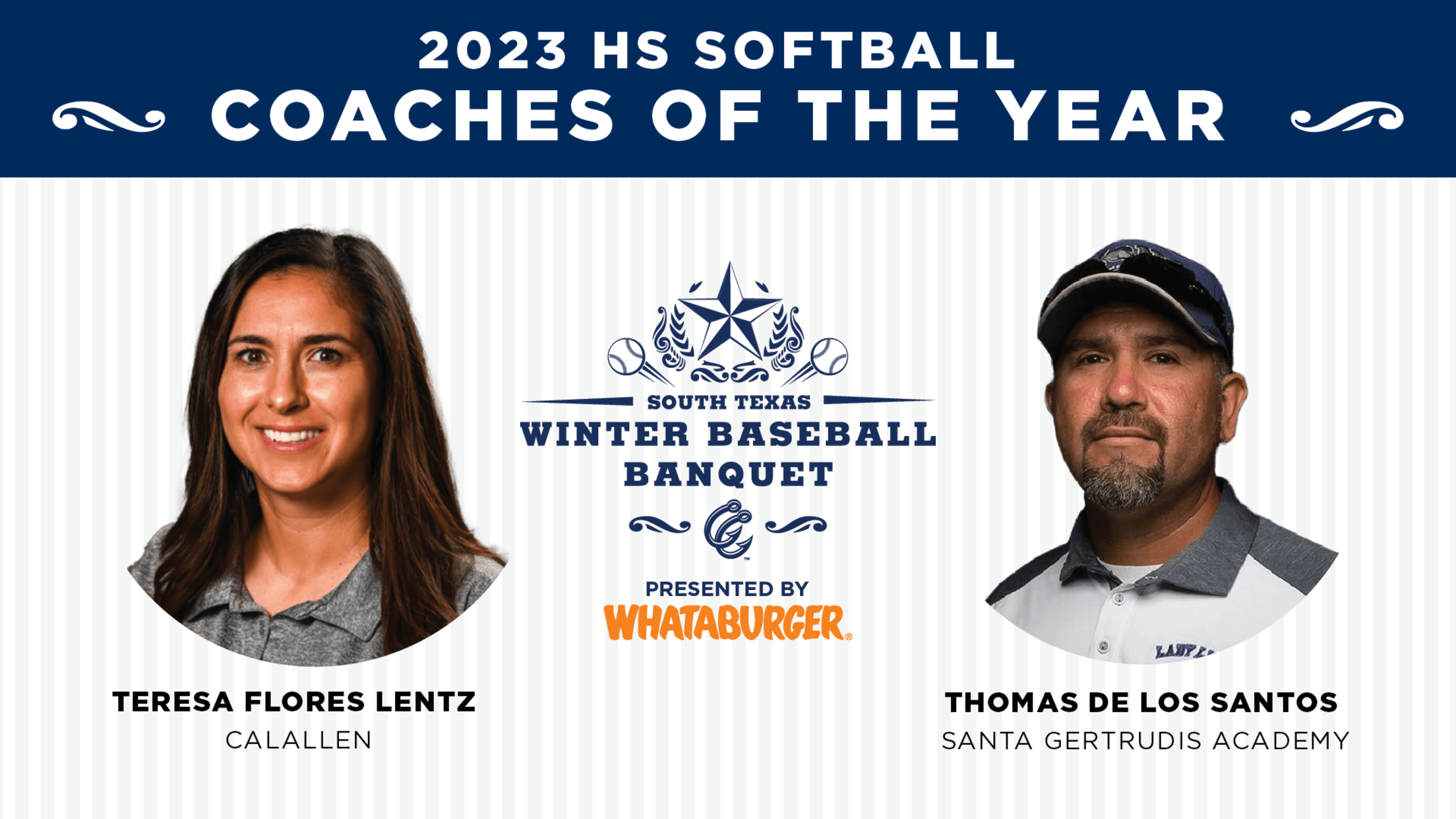 CORPUS CHRISTI – Thomas De Los Santos of Santa Gertrudis Academy and Calallen’s Teresa Flores Lentz will be recognized as the 2023 high school softball coaches of the year at the South Texas Winter Baseball Banquet, presented by Whataburger.