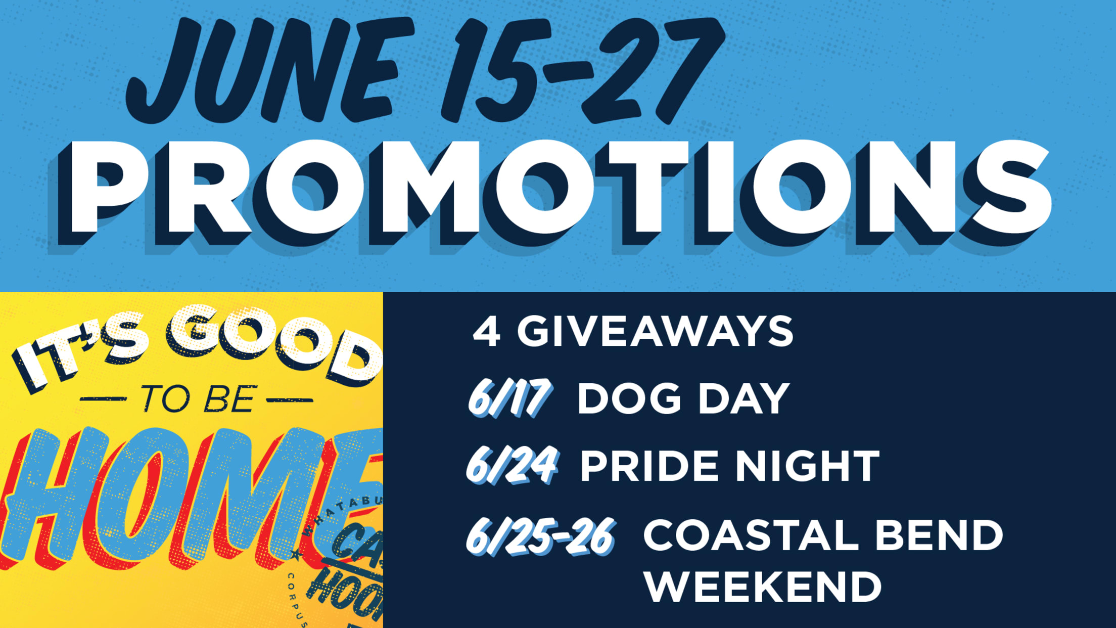Friday, June 25 will be a Coastal Bend Reusable Tumbler giveaway for the first 2,000 fans thanks to AutoNation, and 2,000 more fans will get a Coastal Bend Beach Bag on Saturday, June 26 thanks to the Port of Corpus Christi.
