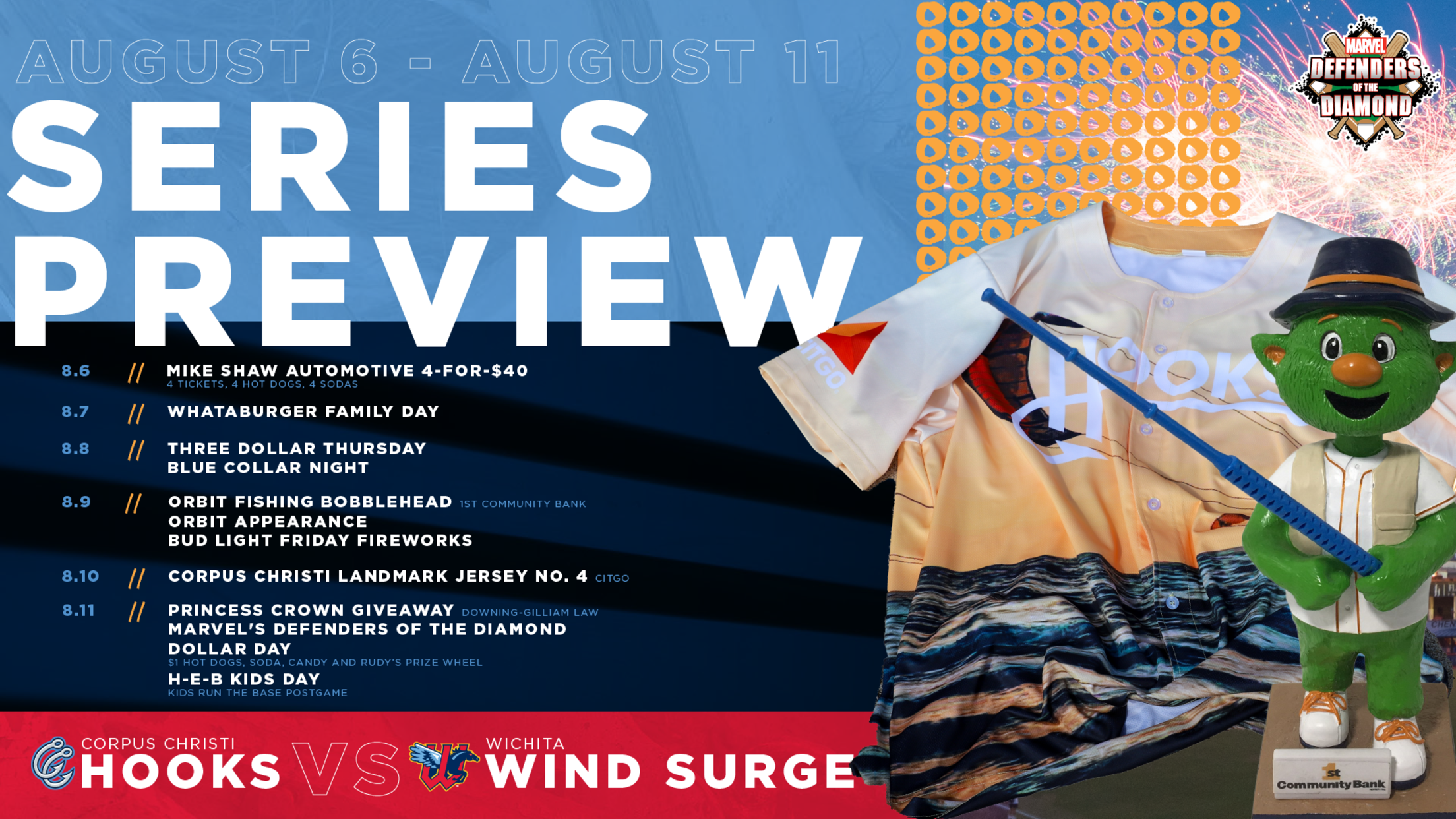 CORPUS CHRISTI – Your Corpus Christi Hooks are back in action Tuesday through Sunday as the Wichita Wind Surge visit the Sparking City for a six-game series.