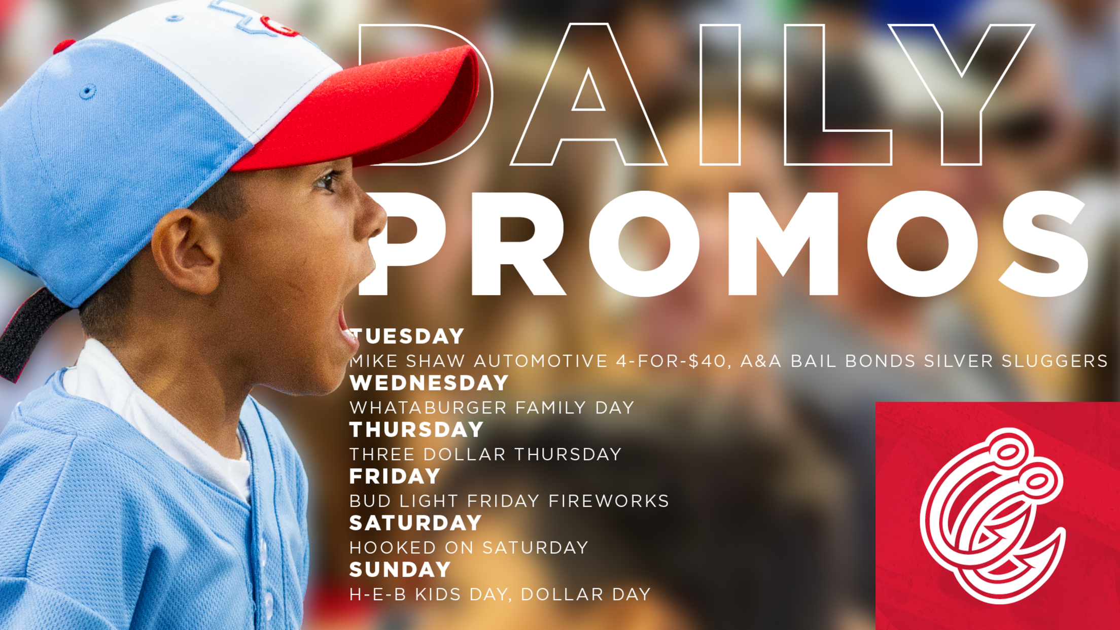 Sundays: End the week at Whataburger Field for H-E-B Kids Day, as kids run the bases postgame. You can also give your wallet a break with Dollar Day featuring $1 hot dogs, soda, candy and Rudy’s Prize Wheel spins. Sunday Media Partners: KSAB Tejano 99.9, KUNO 1400 El Patrón & Telemundo