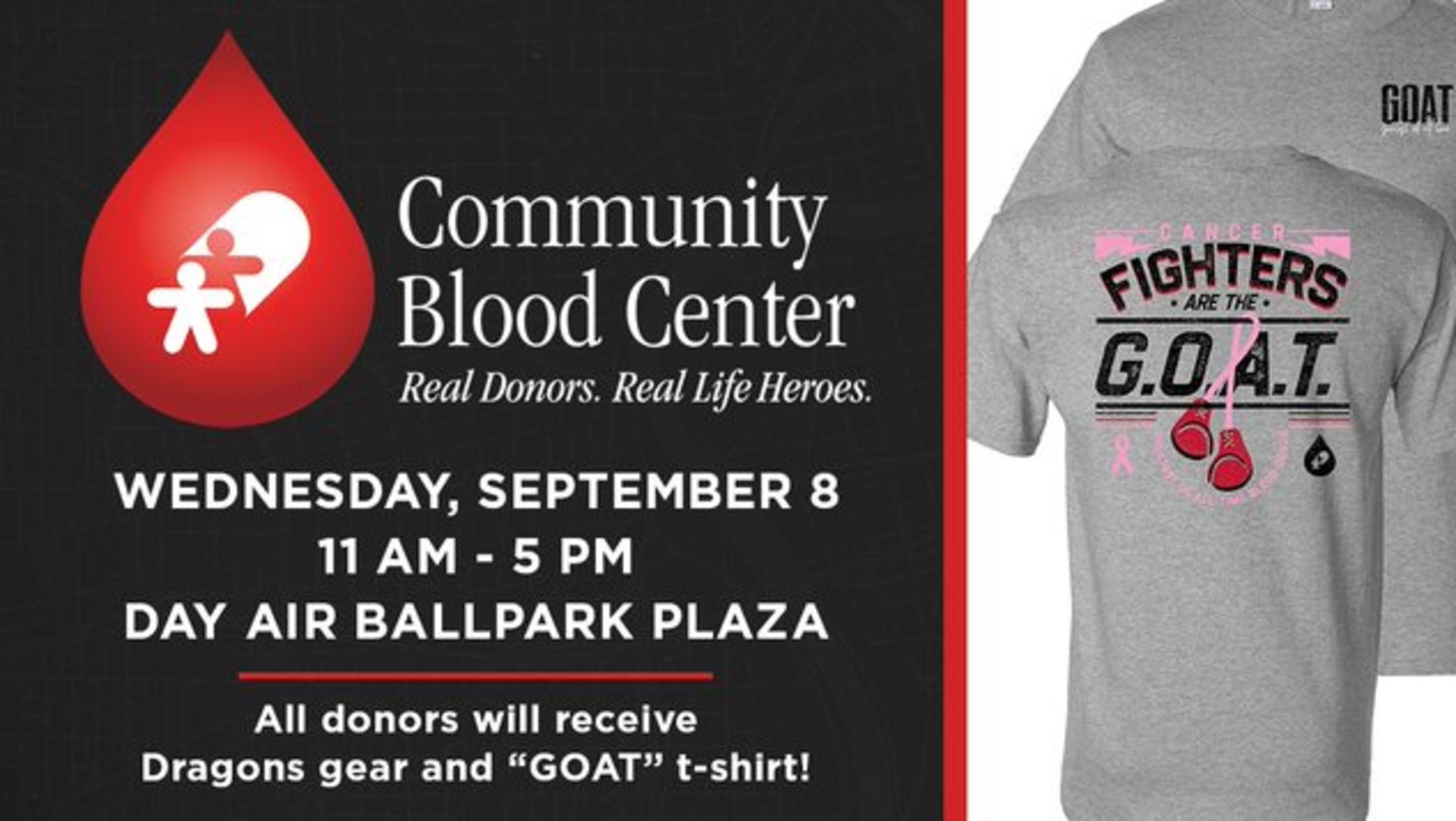 *Dayton, Ohio - *To help rebuild the blood supply participate in the Dayton Dragons community blood drive Wednesday, September 8th from 11 a.m. to 5 p.m. at Day Air Ballpark Plaza, 220 N. Patterson Blvd., Dayton. Everyone who registers to donate can choose a free item of Dragons gear and will also get the new “Cancer Fighters are the GOAT” t-shirt honoring September Blood Cancer and Childhood Cancer Awareness Month and October Breast Cancer Awareness Month.