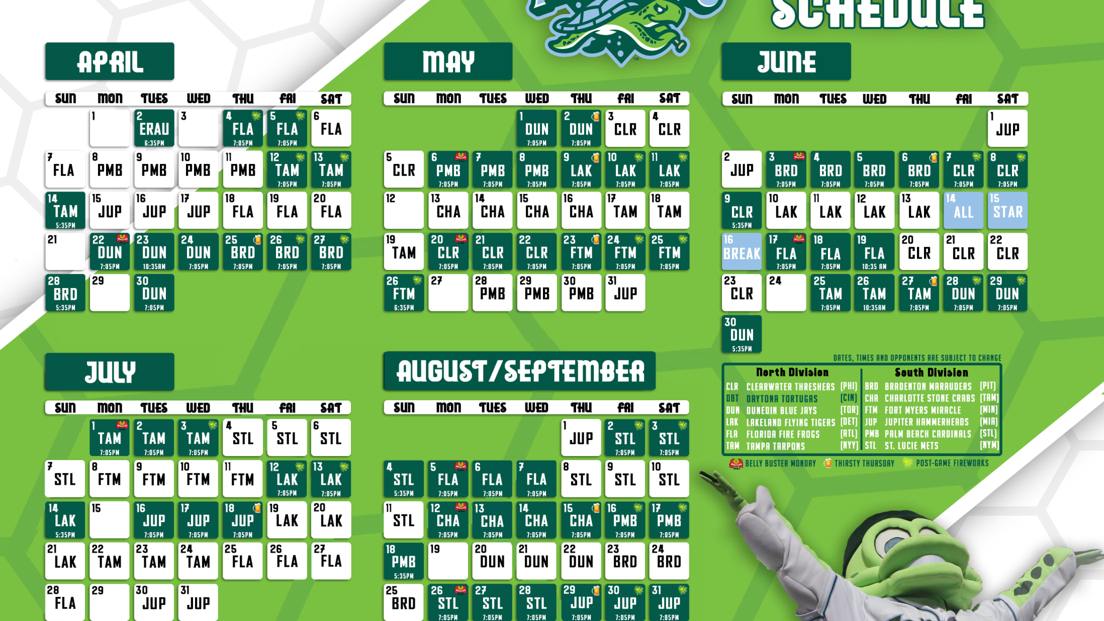DAYTONA BEACH, FL - Coming off a North Division Championship and a Florida State League runner-up season, the Daytona Tortugas are excited to announce the official 2019 schedule. The schedule is highlighted by an unprecedented 73 home games at Jackie Robinson Ballpark, including double-digit home dates on Thirsty Thursdays, Firework