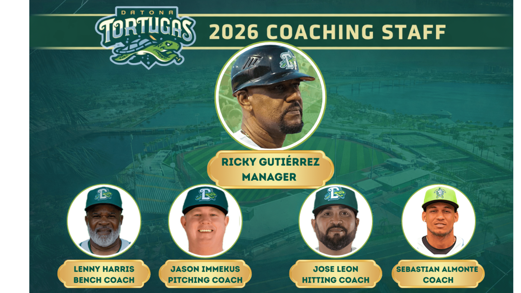 DAYTONA BEACH, Fla. (Feb. 13, 2026) – The Daytona Tortugas, in conjunction with the Cincinnati Reds, have announced the club’s coaching staff for the 2026 season. The staff will be led by manager Ricky Gutiérrez, alongside bench coach Lenny Harris, pitching coach Jason Immekus, hitting coach Jose Leon, and coach