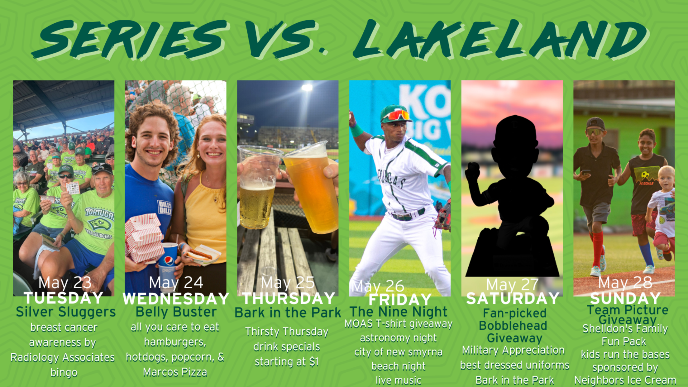 The homestand comes to a close on Sunday, May 28, with Shelldon’s Family Fun Day sponsored MOAS and Central Florida Zoo. Fans are encouraged to arrive early as the 2023 Team Picture presented by ImageWorks will be given away to the first 1,000 fans in the gates and members of the team will be signing pre-game . Members of the Shelldon's Family Fun Pack receive tickets to every Sunday home game in addition to a Tortugas’ hat, a meal voucher — good for a free hot dog, popcorn, and small fountain drink — at the gates. After the final out, youngsters take the diamond with Kids Run The Bases presented by Neighbor’s Ice Cream Parlor. The series finale is penciled in for a 5:00 p.m. first pitch.