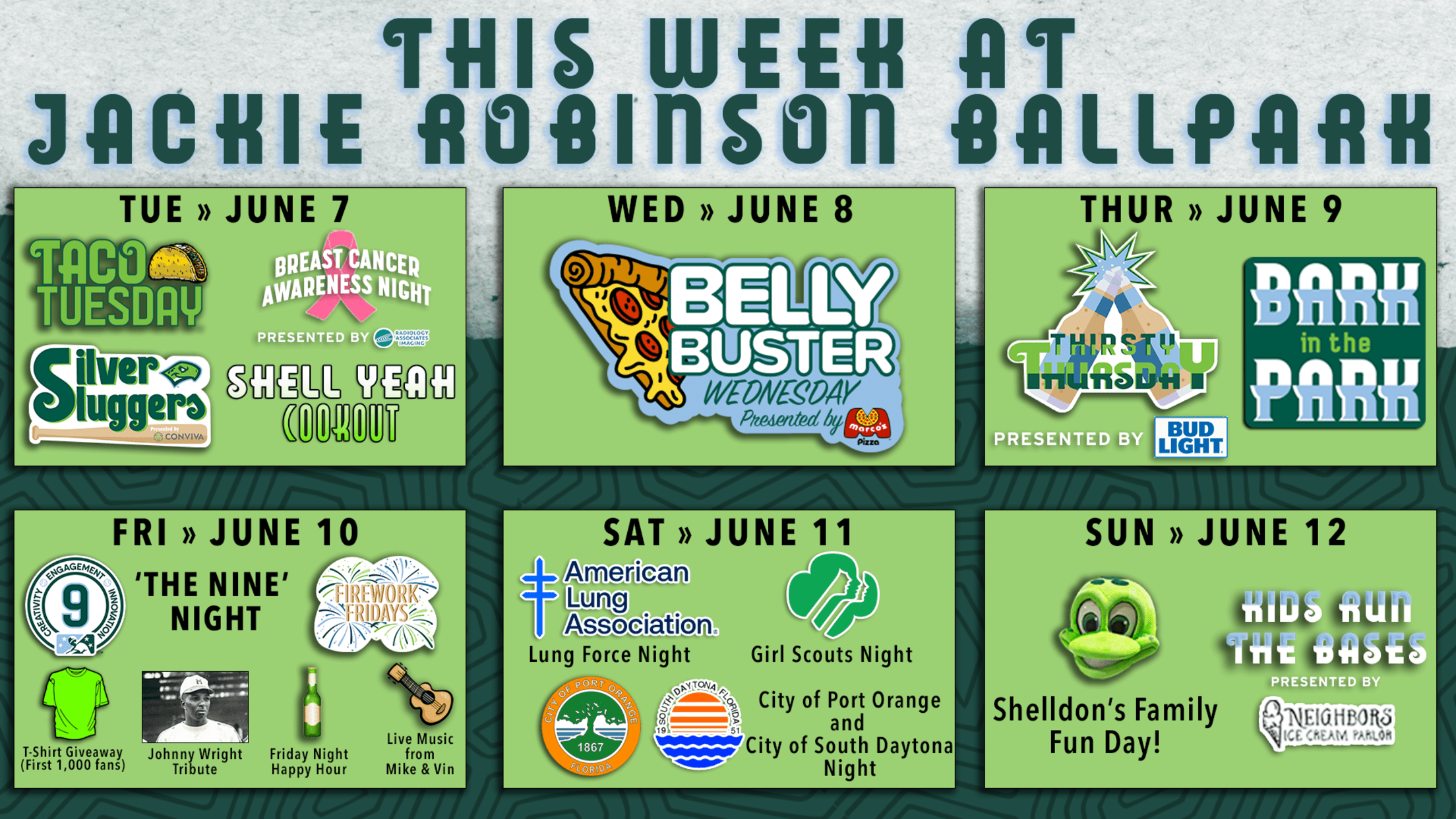 DAYTONA BEACH, Fla. — The Daytona Tortugas return home to Jackie Robinson Ballpark on Tuesday, June 7, for a six-game series against the Fort Myers Mighty Mussels, the Florida State League affiliate of the Minnesota Twins. Among the highlights of the six contests are another ‘The Nine’ Night on Friday