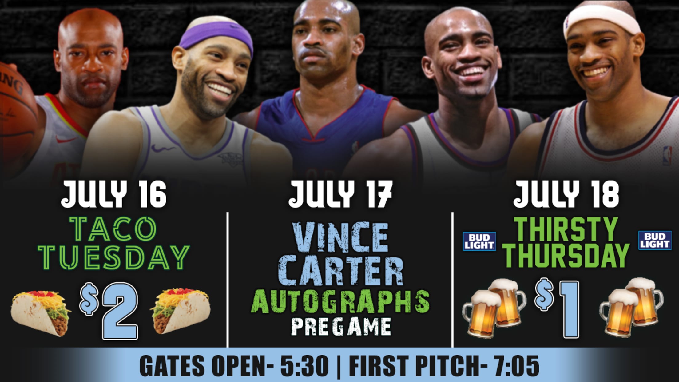 Eight-time NBA All-Star, 2000 NBA Slam Dunk champion, and Daytona Beach native Vince Carter will be at The Jack on Wednesday, July 17. The 21-year NBA veteran will sign autographs along the Riverwalk - located on the third-base concourse - from 5:45 until 6:45 p.m. Other items will be up for auction to benefit the Embassy of Hope Foundation. Additionally, it will be another Wishful Wednesday presented by VyStar Credit Union. Each Wednesday home game, the Tortugas celebrate, recognize, and help raise awareness and funds for local charities around Volusia County. Fans can bring their four-legged furry friends for a "nine-inning vacation" of their own for a Bark in the Park Night presented by NextHome at the Beach. For just $2, patrons can purchase a "pooch pass" to have their pup join them at the game. Game two of the series is scheduled to get underway at 7:05 p.m.