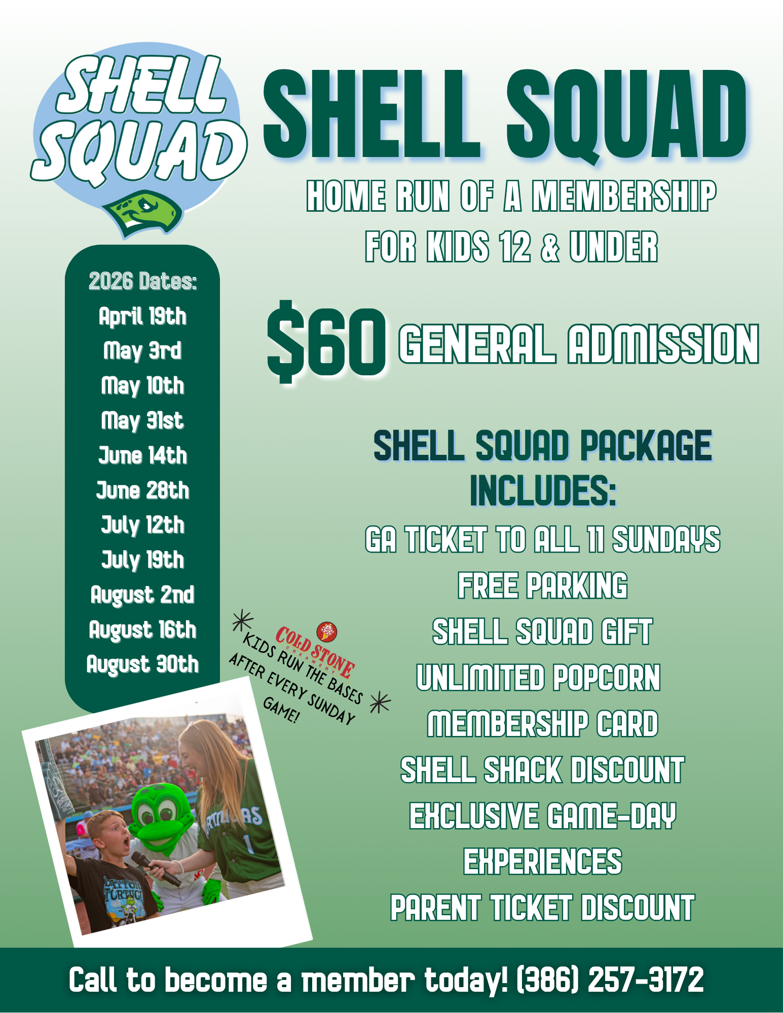 The Shell Squad Kids Club is a homerun of a membership for kids ages 12 and under! The kids club includes a general admission tickets to all Eleven (11) Sunday Tortuga home games, unlimited popcorn, member only events (ex: pre-Season Party with Shelldon & Autograph Signing), a Shell Shack discount, a Shell Squad membership card & gift, Free Parking, and a PARENT TICKET DISCOUNT - all for just $60!