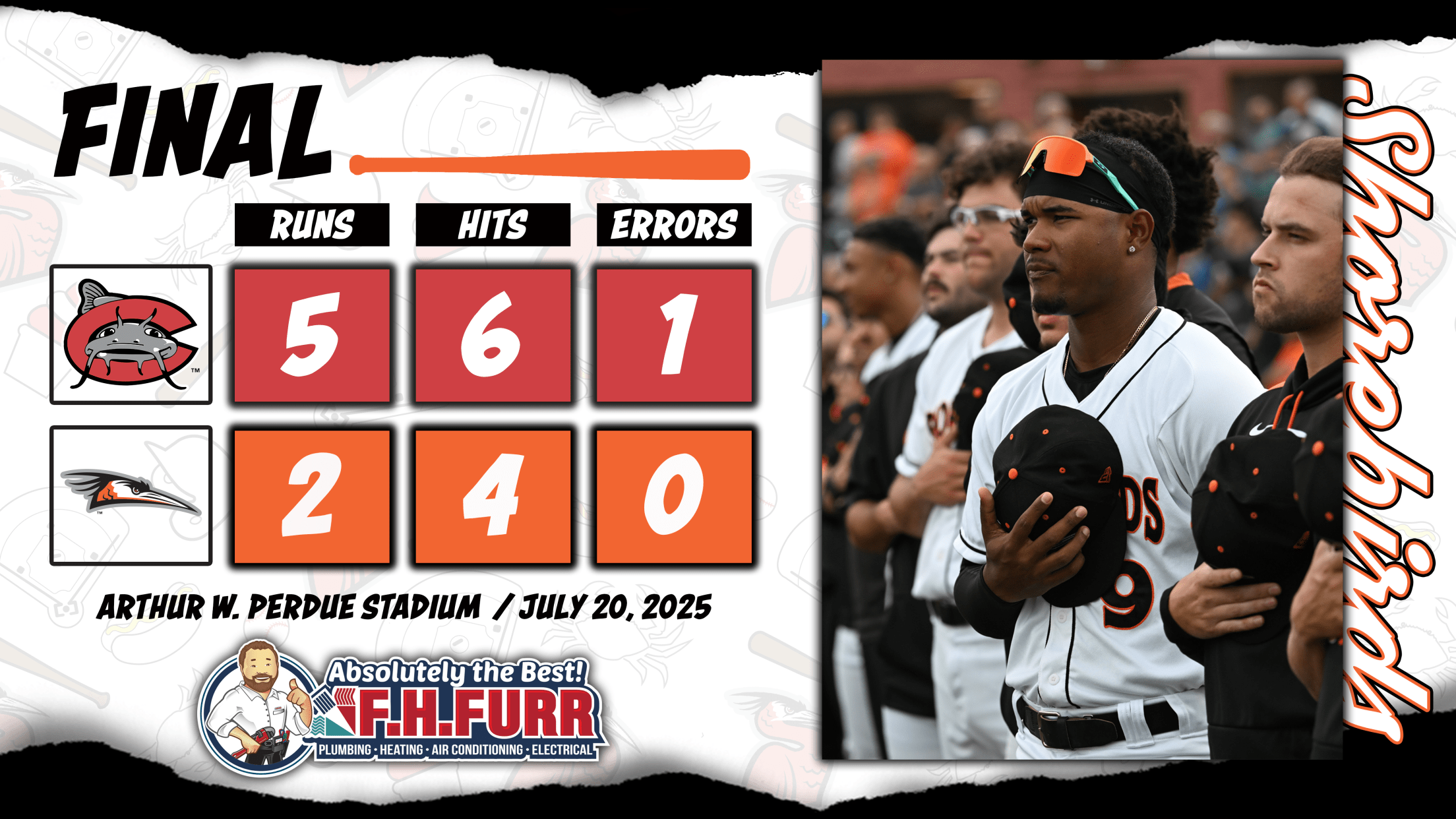 SALISBURY, MD: The Delmarva Shorebirds (34-56, 7-17) fell to the Carolina Mudcats (51-35, 15-7) in Sunday's series finale by a final score of 5-2.