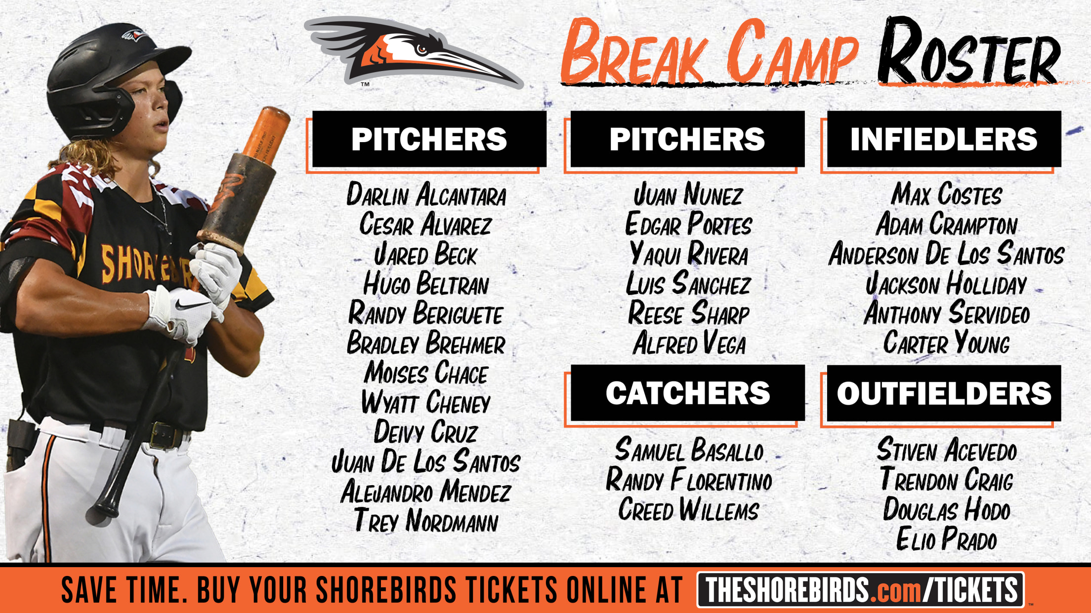 Delmarva Break Camp Roster Announced Three Orioles Top-30 Prospects and 24 Returnees Highlight Shorebirds Break Camp Roster Salisbury, MD: The Delmarva Shorebirds, in conjunction with the Baltimore Orioles have officially announced the team’s break camp roster for 2023. The roster is highlighted by three of the Orioles’ top-30 prospects according
