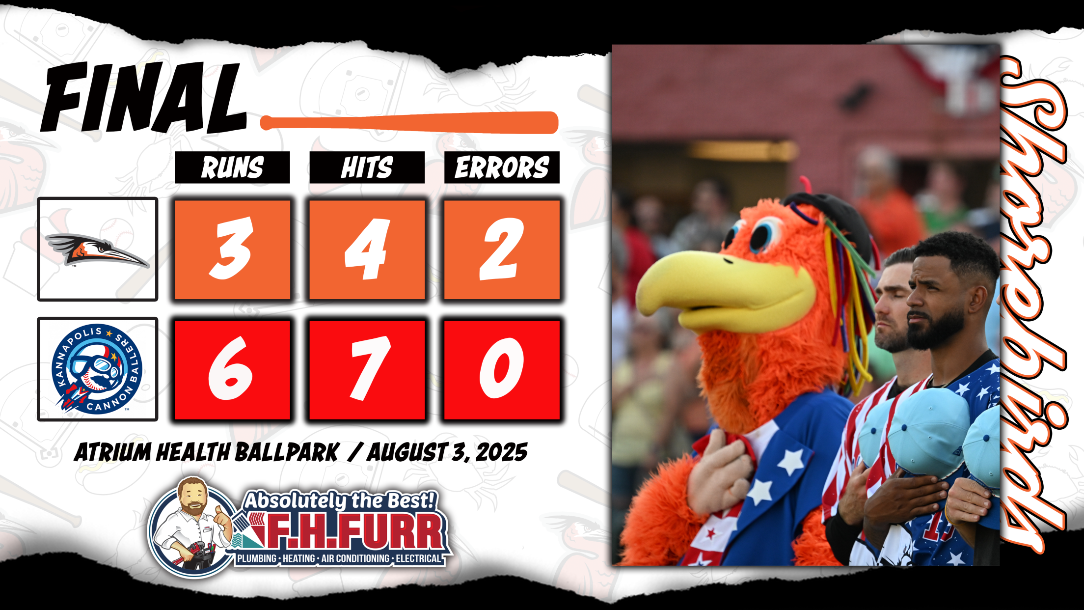 KANNAPOLIS, NC: The Delmarva Shorebirds (38-63, 11-24) were defeated by the Kannapolis Cannon Ballers (49-53, 17-19) in Sunday's series finale, 6-3.