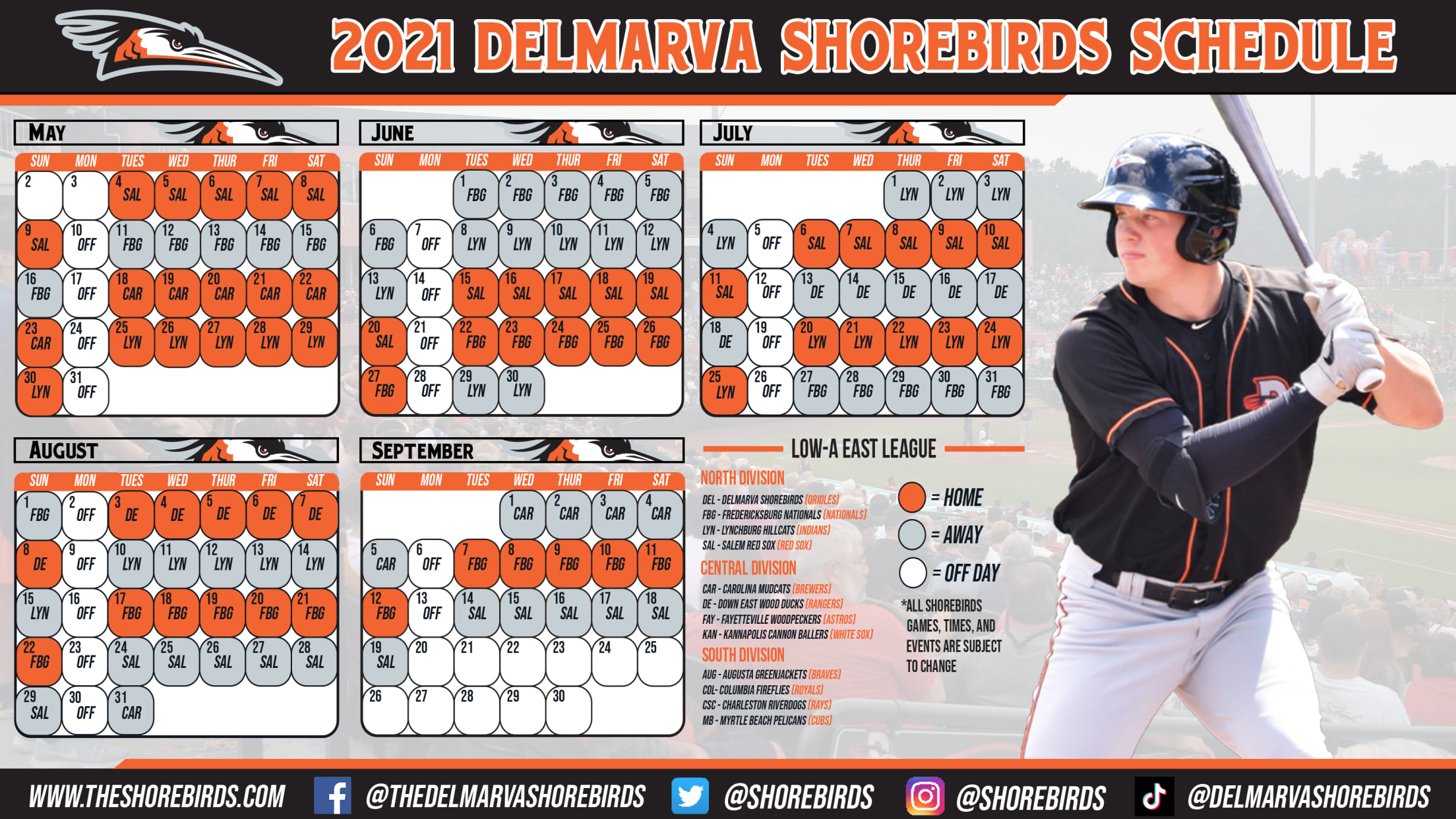 Formerly a member of the South Atlantic League, the Shorebirds will now play in the Low-A East League consisting of twelve teams evenly divided into three divisions with seven teams serving as first-time opponents with no previous head-to-head meetings with the Shorebirds. Joining the Shorebirds in the North Division are the Fredericksburg Nationals (Washington Nationals), Lynchburg Hillcats (Cleveland Indians), and Salem Red Sox (Boston Red Sox) who all previously played in the Advanced-A Carolina League.