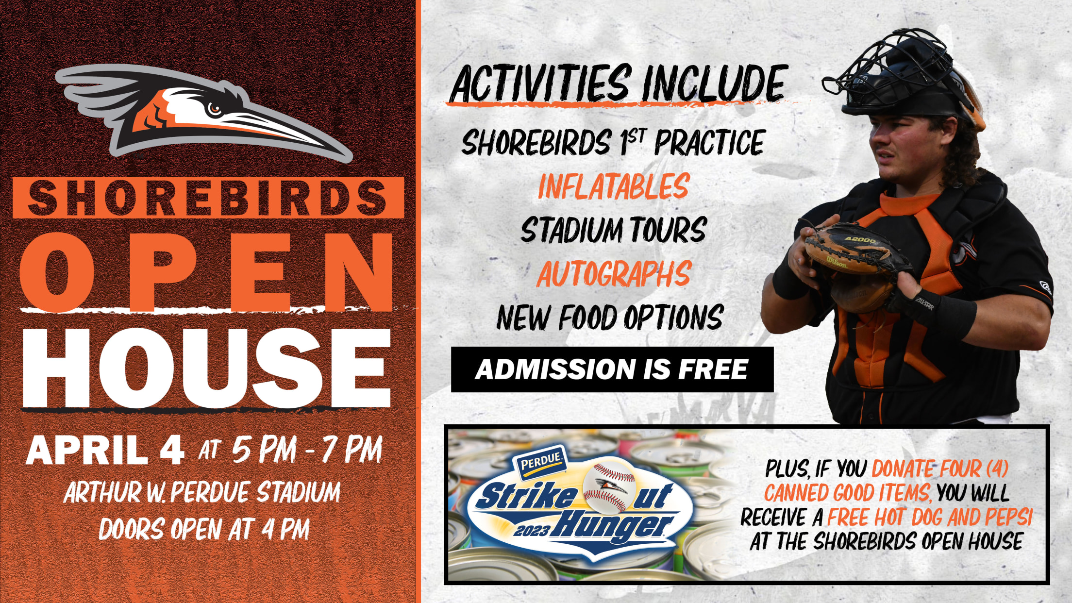 Admission to the Shorebirds Open House is FREE for all fans and all fans that bring four (4) canned food items to donate to the Perdue Strike Out Hunger Campaign will receive a FREE hot dog and Pepsi. Plus, the Shorebirds Flock Shop will be open for fans to purchase the newest Shorebirds merchandise and on April 4 only, the entire Flock Shop will be 10% off with all orders of $25 or more receiving a free mystery Shorebirds bobblehead.