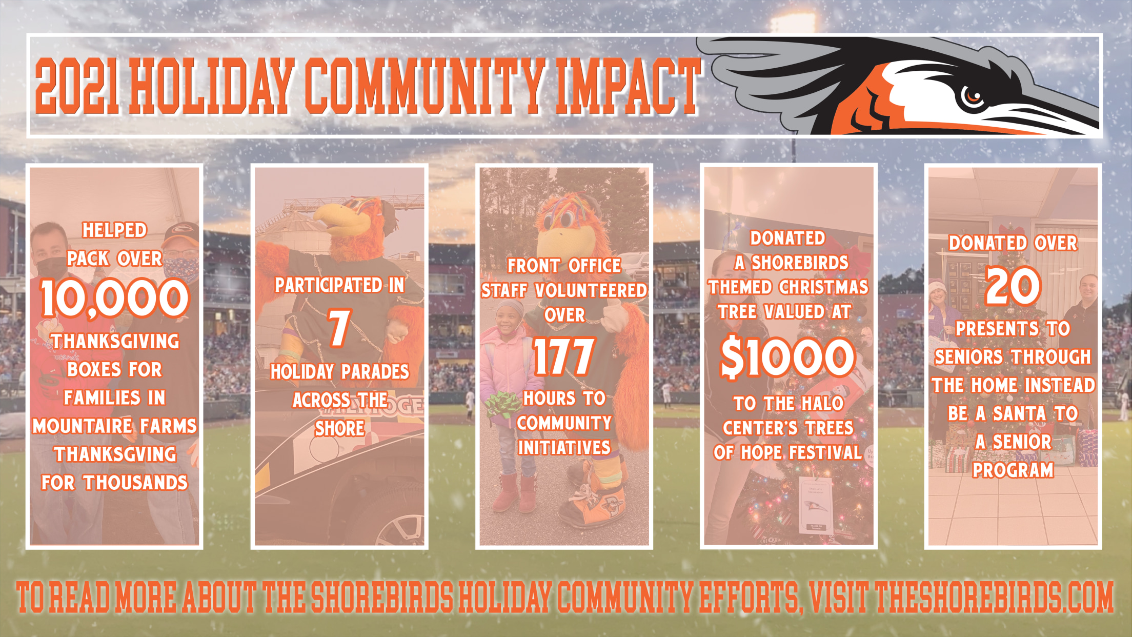 After the silver anniversary season of Delmarva Shorebirds baseball, the ‘Birds were eager to join together with community leaders to keep the good times rolling with an emphasis on creating a positive impact in our community. From packing boxes for those in need, to holiday gift drives, parades, and more,