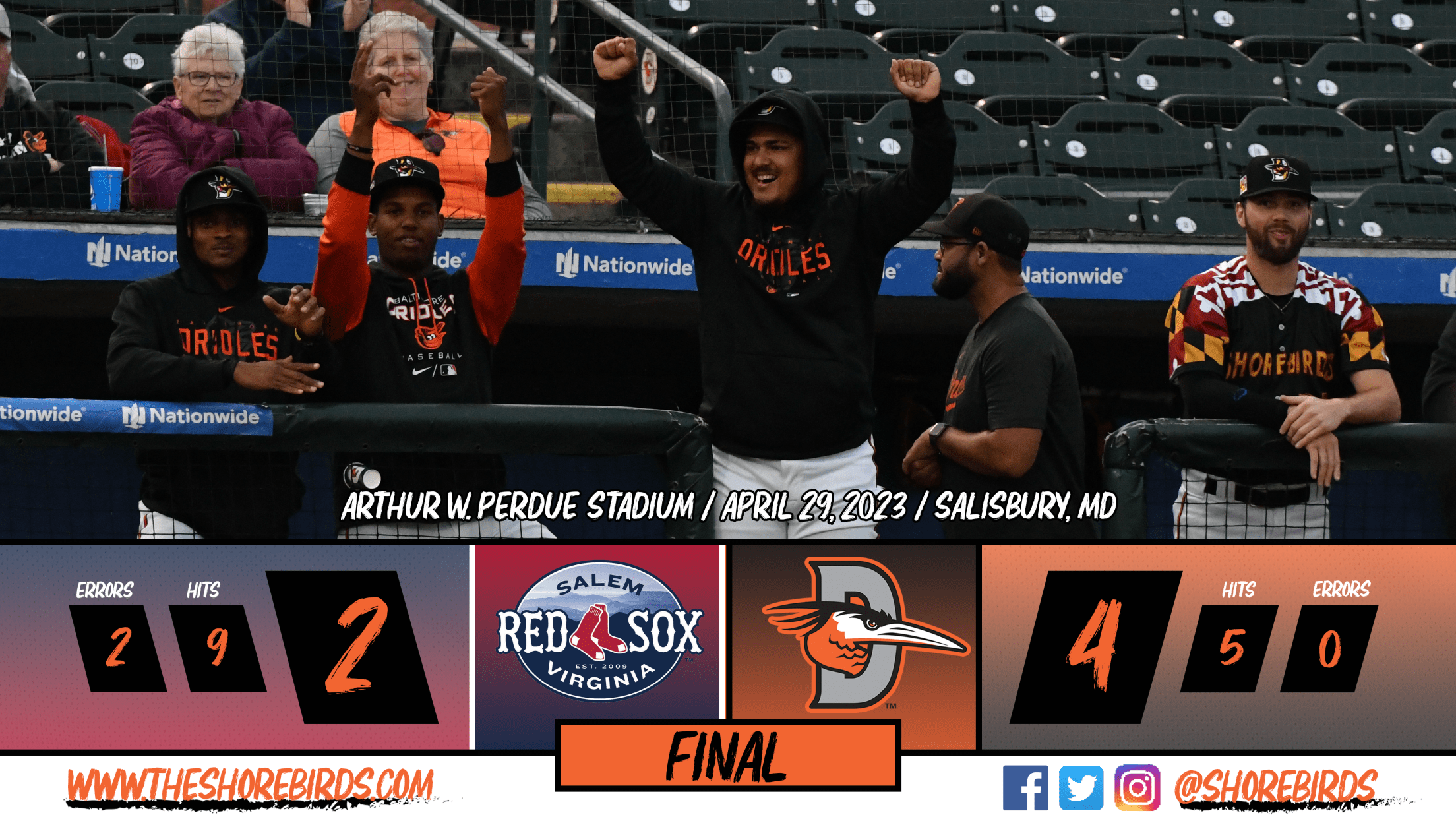 SALISBURY, MD: The Delmarva Shorebirds (12-7) took care of business against the Salem Red Sox (9-11) twice on Saturday night as they took both games of the doubleheader, winning game one 5-3 and game two 4-2.