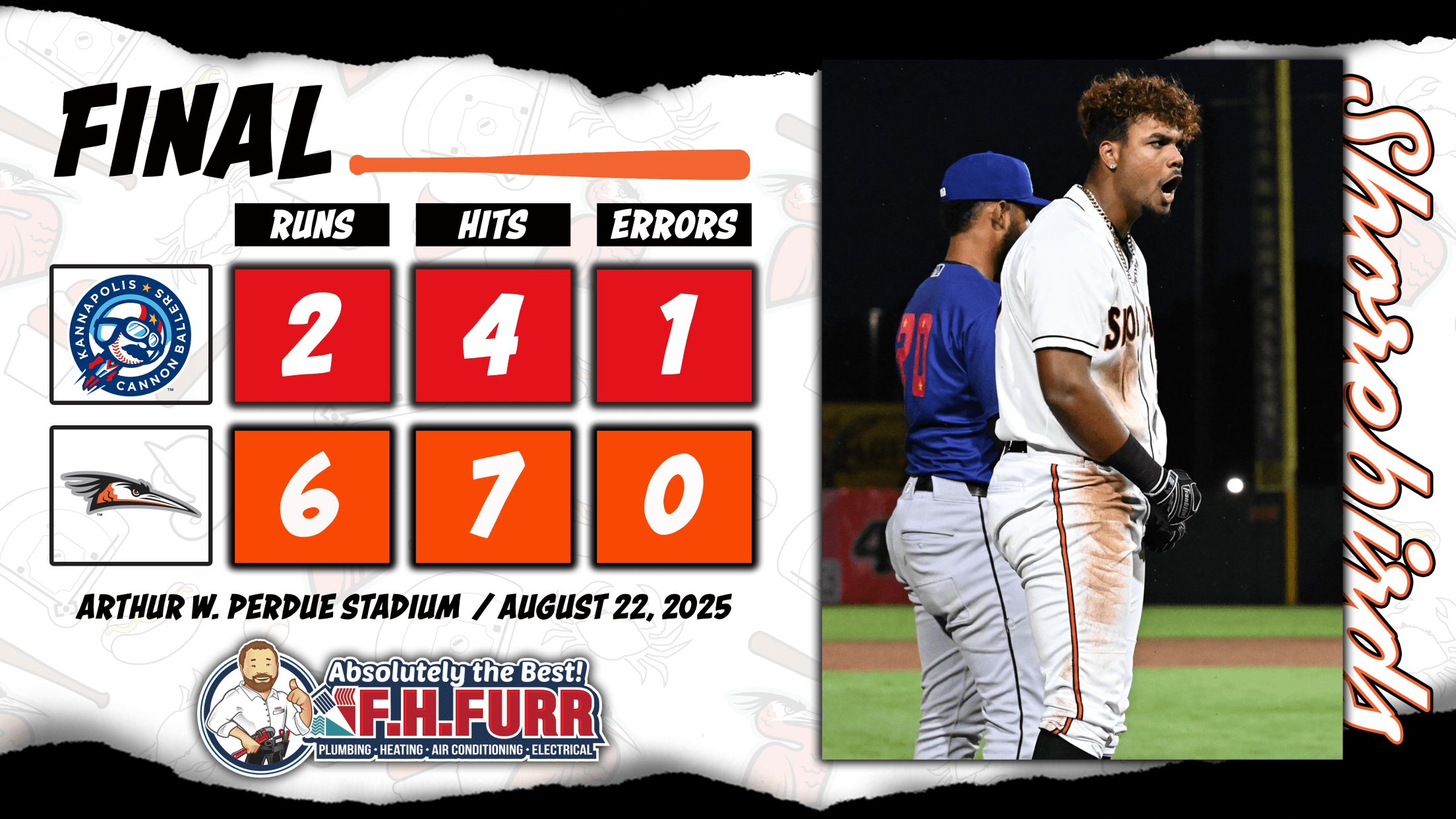 SALISBURY, MD: The Delmarva Shorebirds (44-73, 17-34) topped the Kannapolis Cannon Ballers (53-65, 21-31) with a 6-2 win on Friday night.