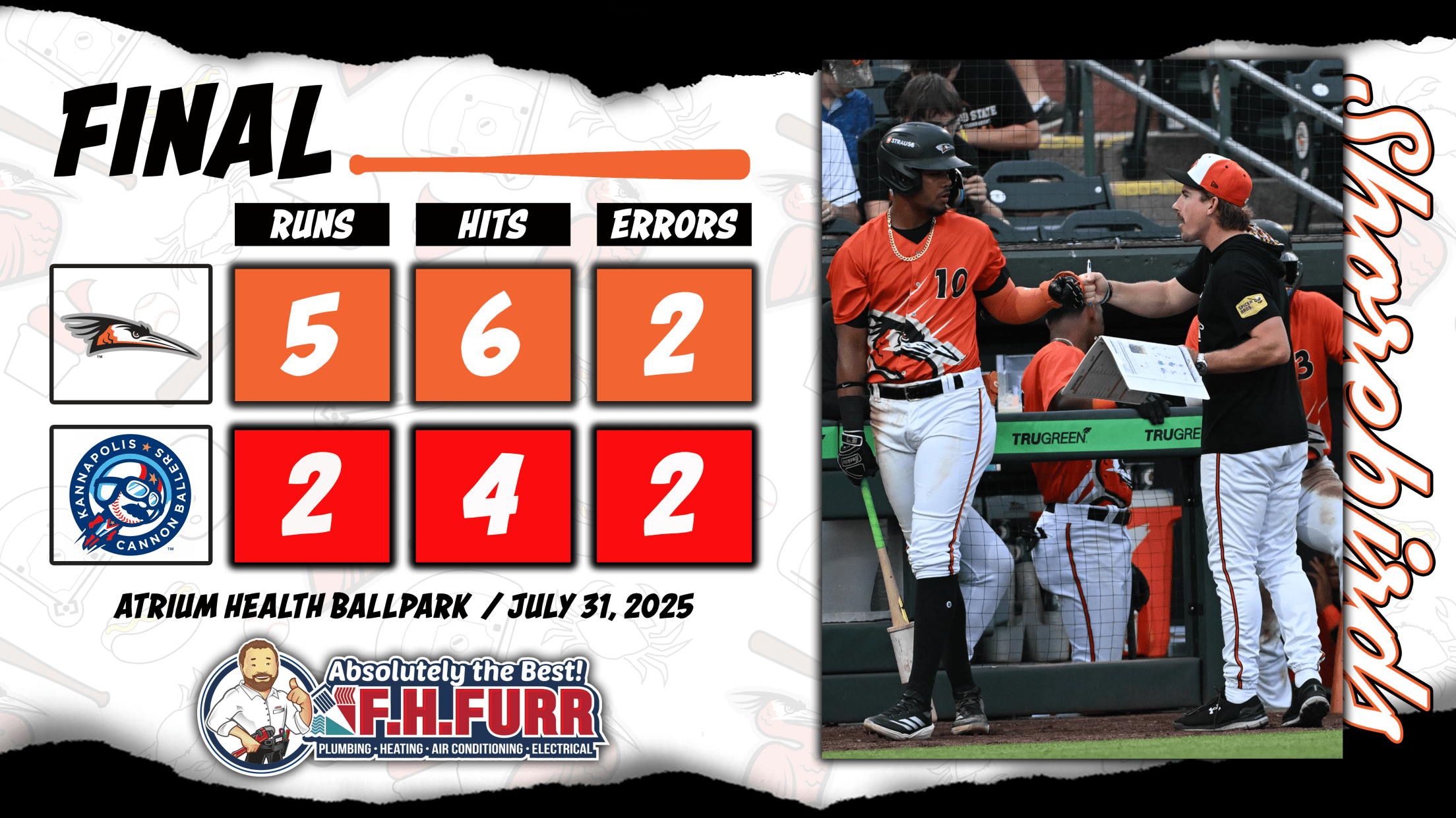 KANNAPOLIS, NC: The Delmarva Shorebirds (38-60, 11-21) defeated the Kannapolis Cannon Ballers (36-53, 14-19) in extra innings for the second consecutive night with a 5-2 win in eight innings.