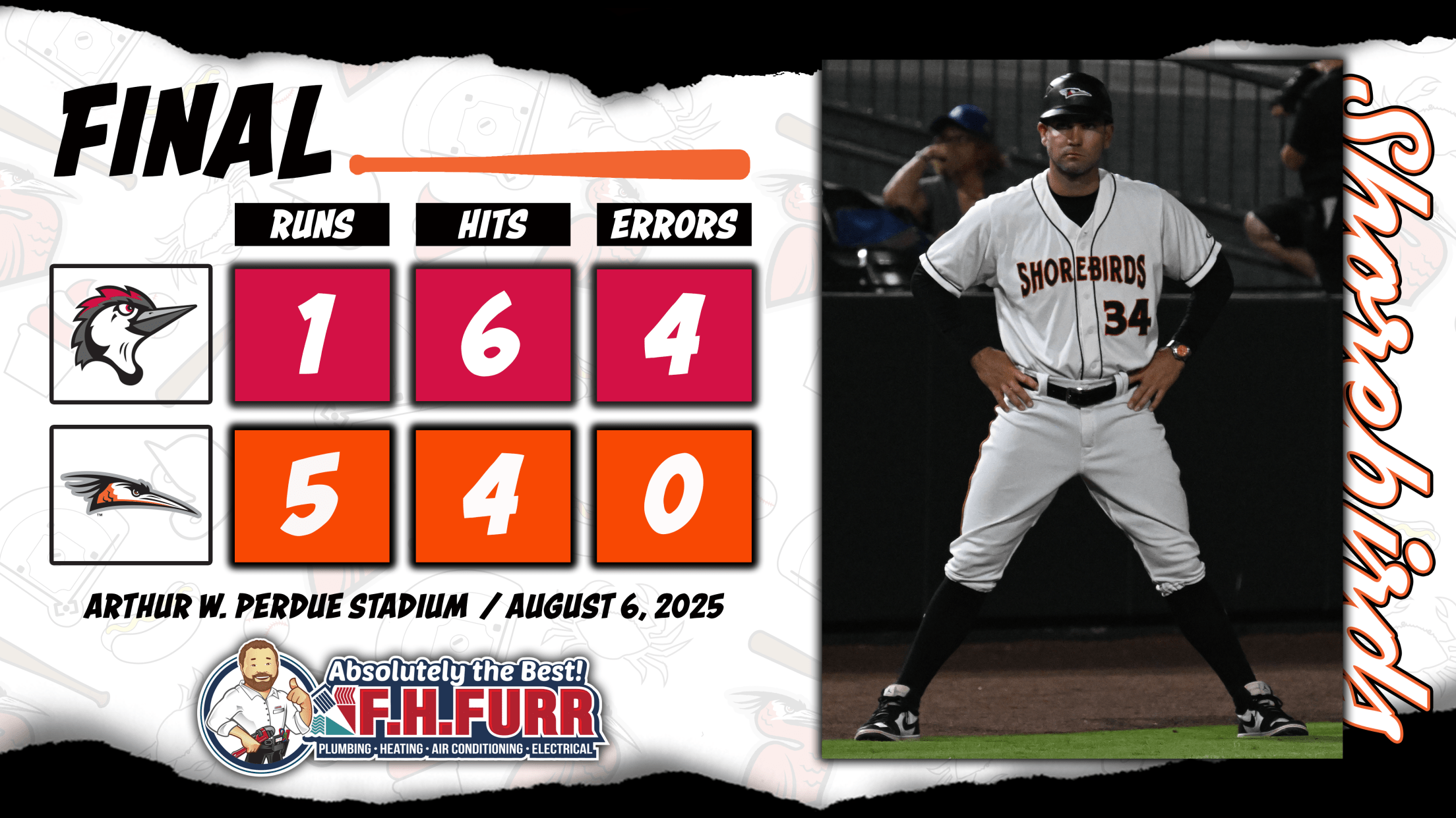 SALISBURY, MD: The Delmarva Shorebirds (39-64, 12-25) evened their series against the Fayetteville Woodpeckers (54-48, 18-18) on Wednesday with a 5-1 win.