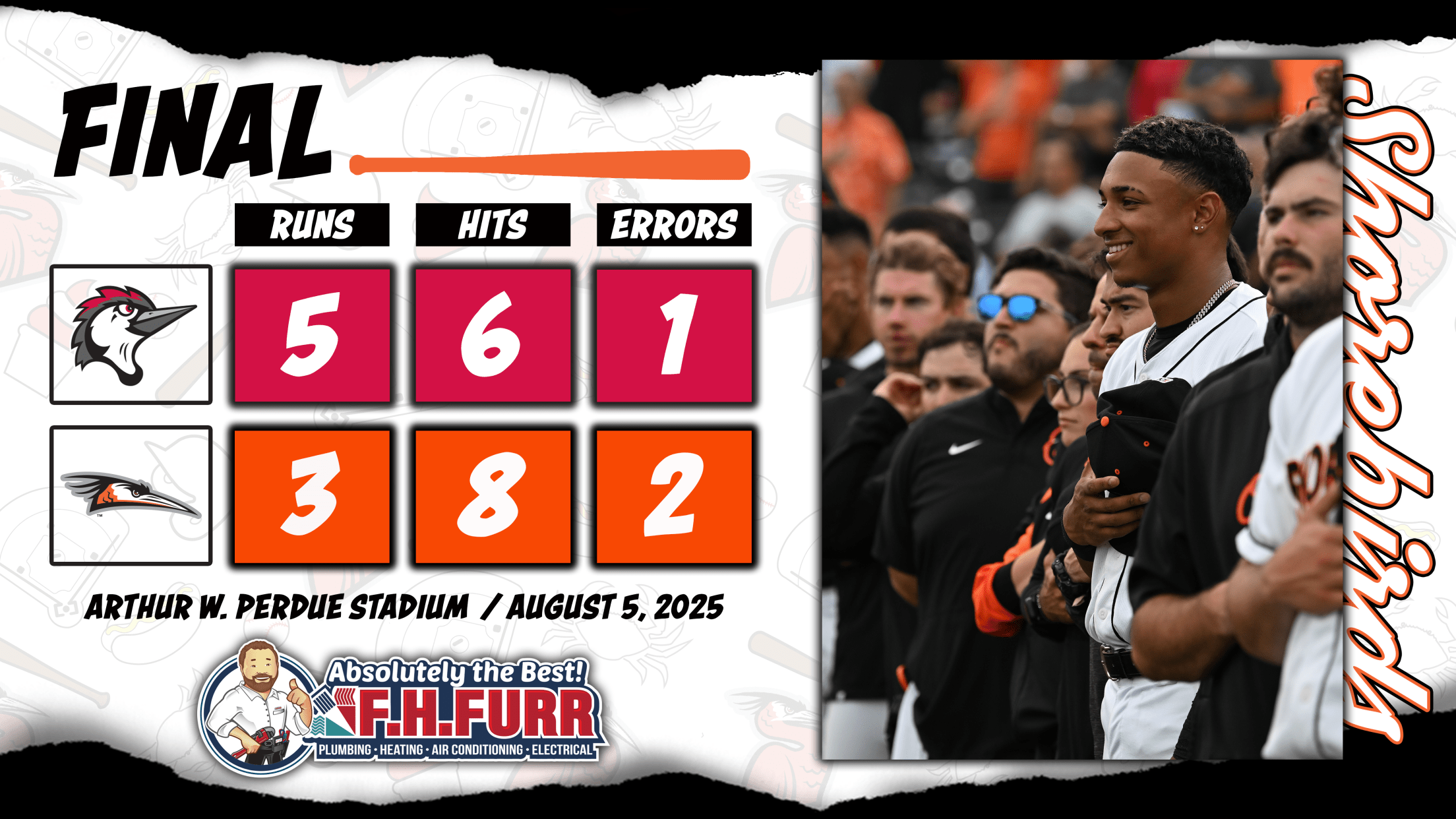 SALISBURY, MD: The Delmarva Shorebirds (38-64, 11-25) were defeated by the Fayetteville Woodpeckers (54-47, 18-17) by a final score of 5-3 on Tuesday night.