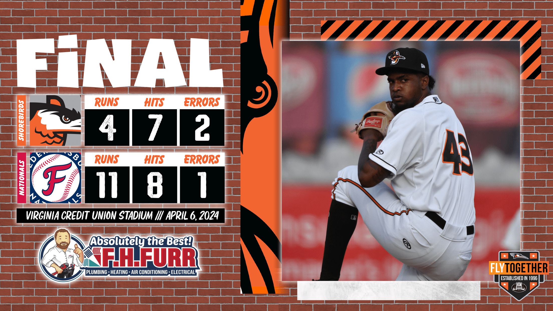 Fredericksburg Wins First Two Games Versus Delmarva Big Innings Haunt Shorebirds for Second Straight Night FREDERICKSBURG, VA: The Delmarva Shorebirds (0-2) fell to the Fredericksburg Nationals (2-0) for the second straight night as they overcame another early deficit to win, 11-4. The Shorebirds were off to the races in the