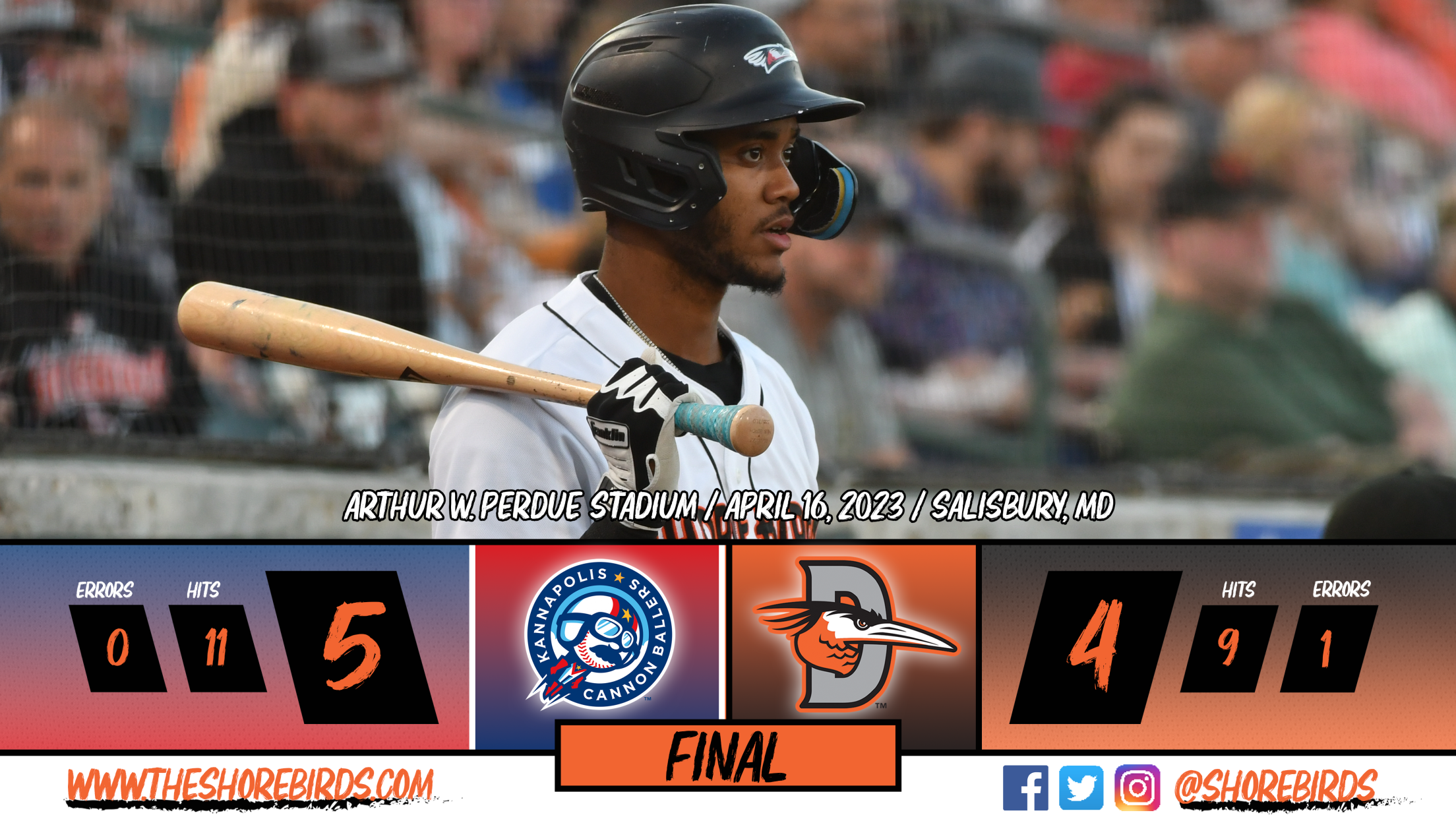 Kannapolis Holds Off Delmarva to Win Series Shorebirds Suffer Fourth Straight Defeat SALISBURY, MD: The Delmarva Shorebirds (4-5) fell just short in the final game of the series against the Kannapolis Cannon Ballers (5-3) by a score of 5-4 on Sunday afternoon. Kannapolis manufactured the first run of the game