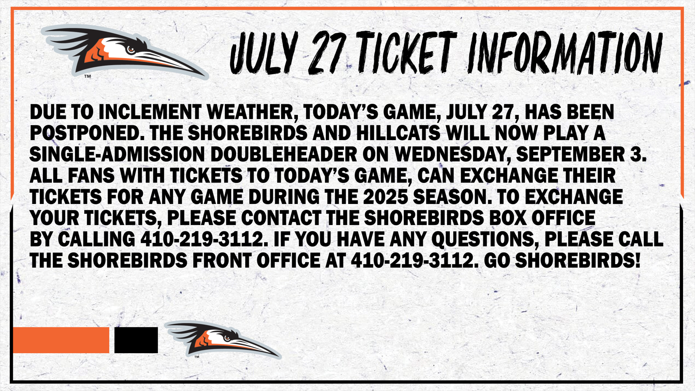 Fans with tickets to tonight's game (7/27) can exchange their tickets for any other 2025 Shorebirds home game this season. To exchange your tickets, please visit the Shorebirds Box office or call the Shorebirds Box Office at 410-219-3112.
