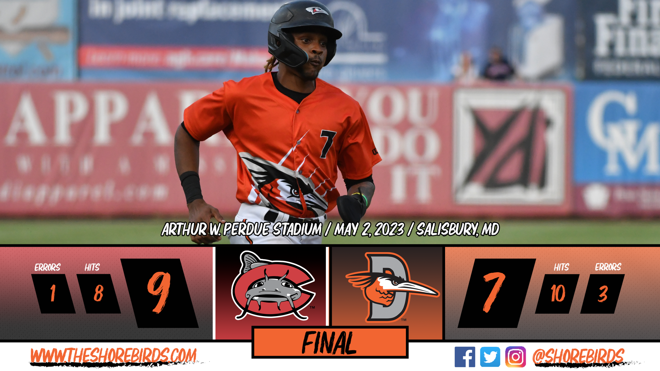 It would stay 9-7 into the ninth and in the bottom half, the Shorebirds brought the tying run to the plate with one out, but Tanner Shears struck out both Stiven Acevedo and Anderson De Los Santos to end the game as the Mudcats would win the opener 9-7.