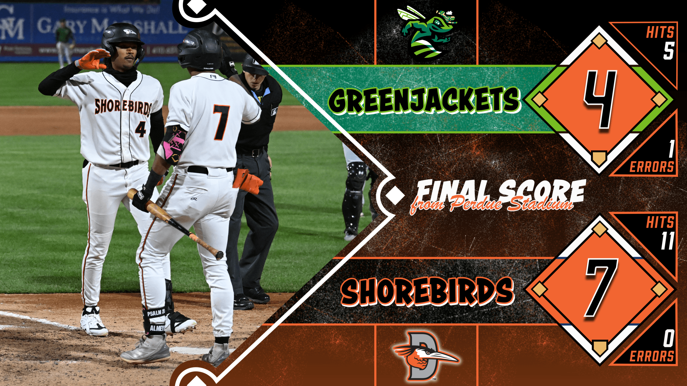 SALISBURY, MD: The Delmarva Shorebirds (3-5) earned their second win of the week over the Augusta GreenJackets (3-5) with a 7-4 victory on Saturday night.