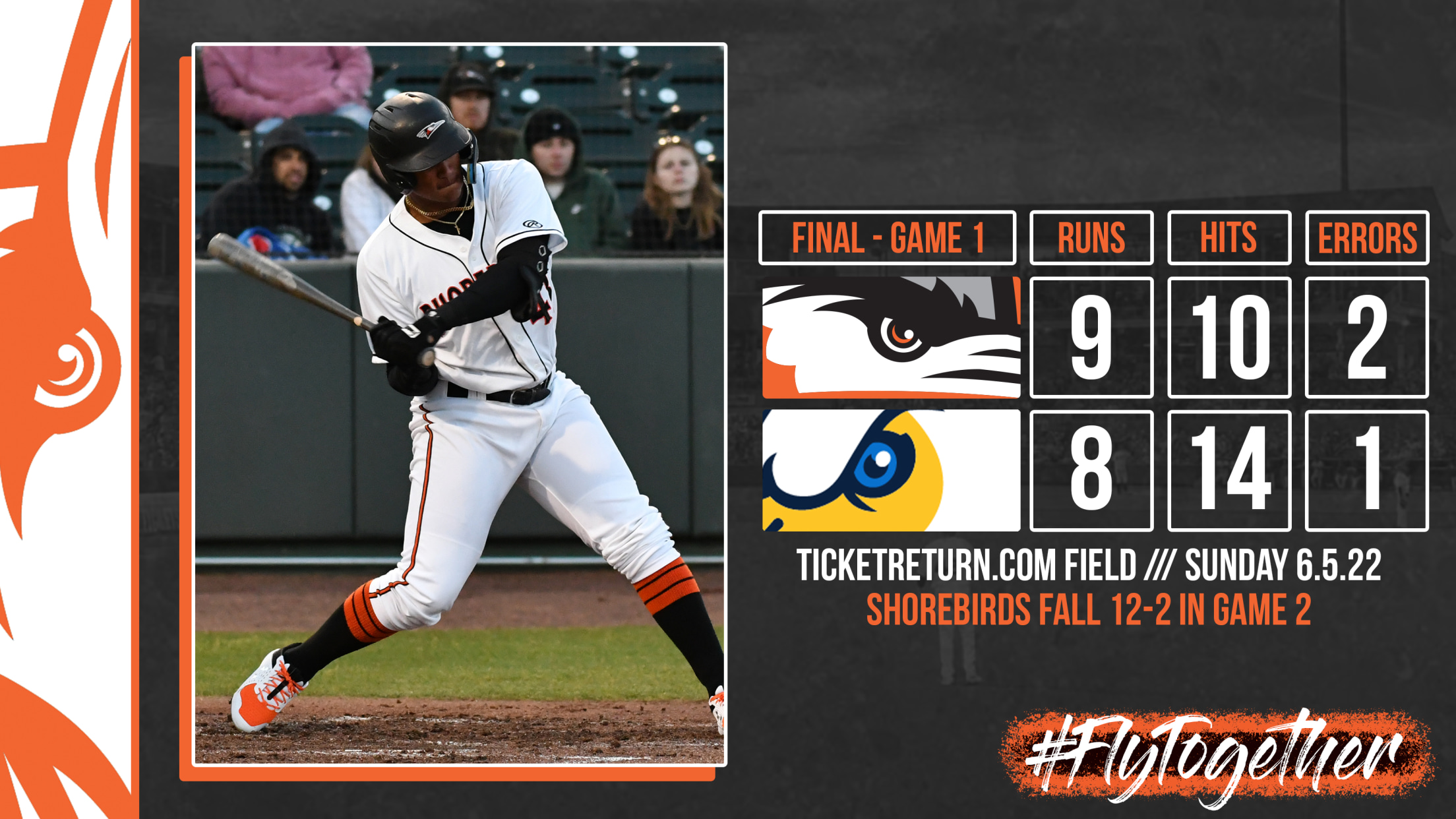 MYRTLE BEACH, SC. -- The Shorebirds split the partial doubleheader on Sunday evening winning 9-8 in the continuation of the June 3 suspended game, but fell in the second contest 12-2 to the Myrtle Beach Pelicans. In Game 1, a continuation of the June 3 game suspended in the fourth