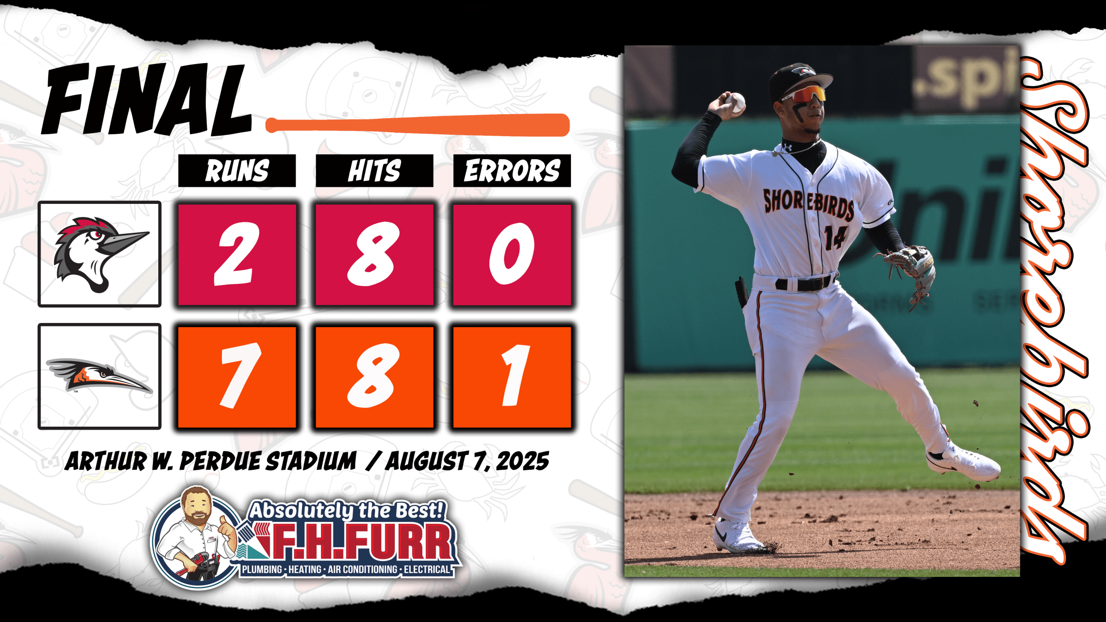 SALISBURY, MD: The Delmarva Shorebirds (40-64, 13-25) won their second straight game against the Fayetteville Woodpeckers (54-49, 18-19) on Thursday by a final score of 7-2.