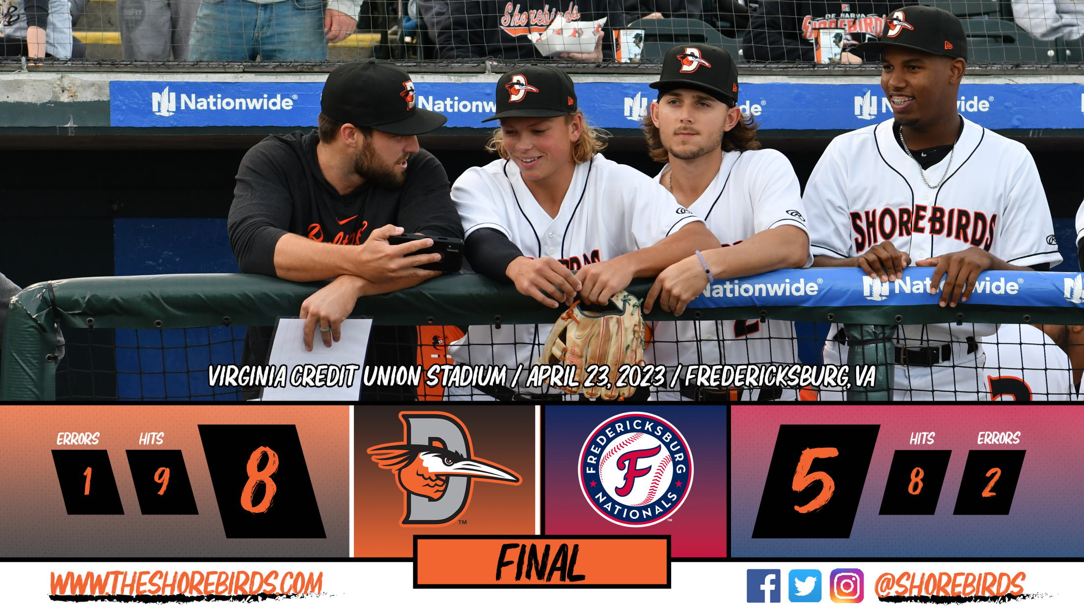 *FREDERICKSBURG, VA: *The Delmarva Shorebirds (8-6) rallied to defeat the Fredericksburg Nationals (4-10) in the series finale on Sunday afternoon by a score of 8-5.
